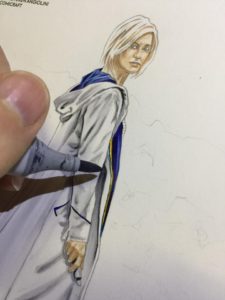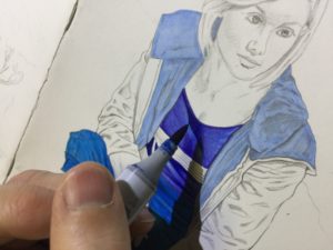 I meant to get some shots of my pencils, but totally forgot to when I started. I sized my reference photos to fit where I needed them, and then printed them out and used my lightbox to get the outlines of the photos onto the cover stock. As usual I’m working with a yellow #2 pencil. I also occasionally will use a #2 0.09mm click-pencil. I finished the details and shading by hand in pencil, then started on the flesh-tones using Copic markers.