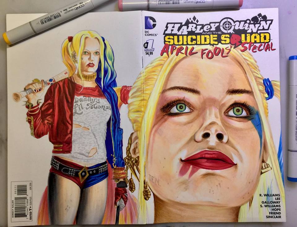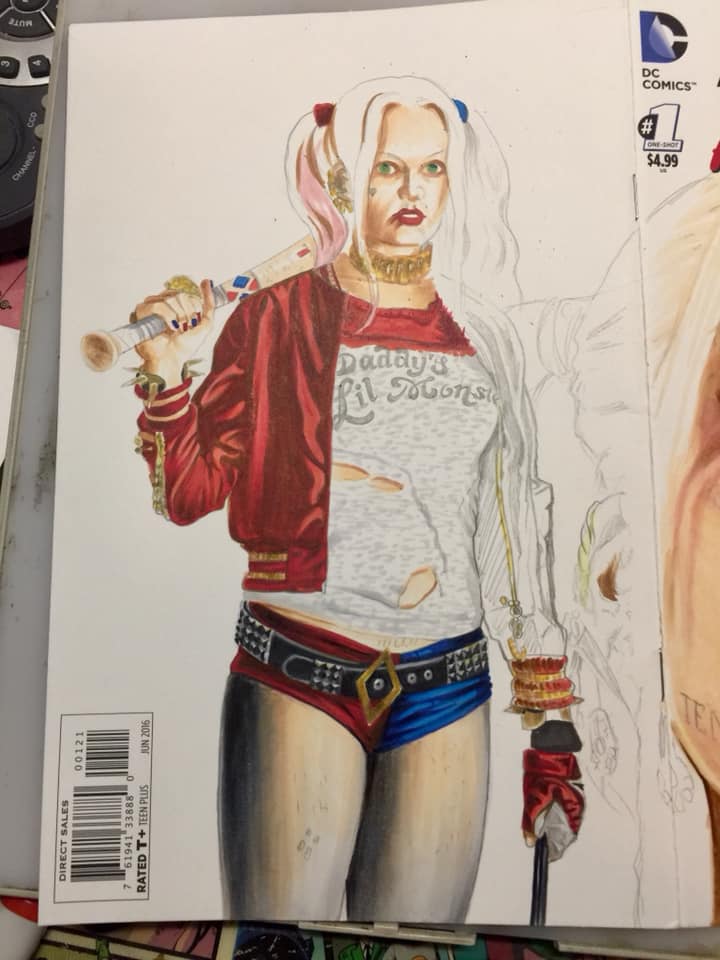 Luckily the statue that came with my “Suicide Squad” BluRay/DVD was awesome! Could see all of the tats, including the stomach one that was partially covered by her tee in the photo. This statue also gave me a better idea of how to draw the fishnets…which were probably the hardest part of the whole project!
