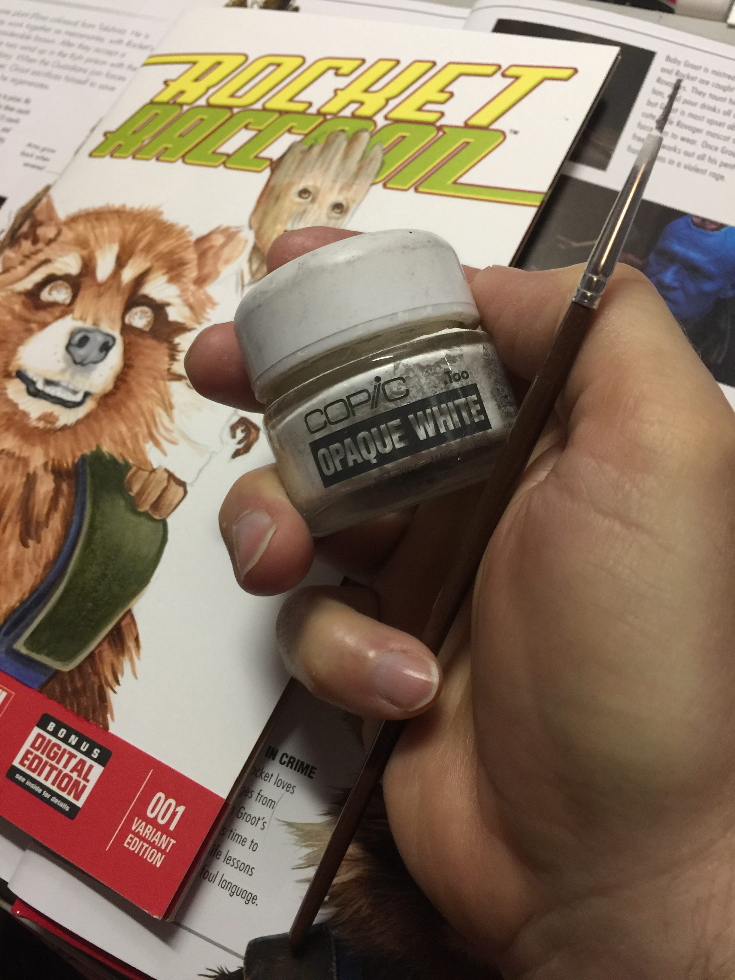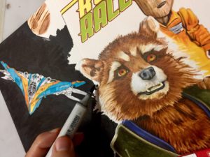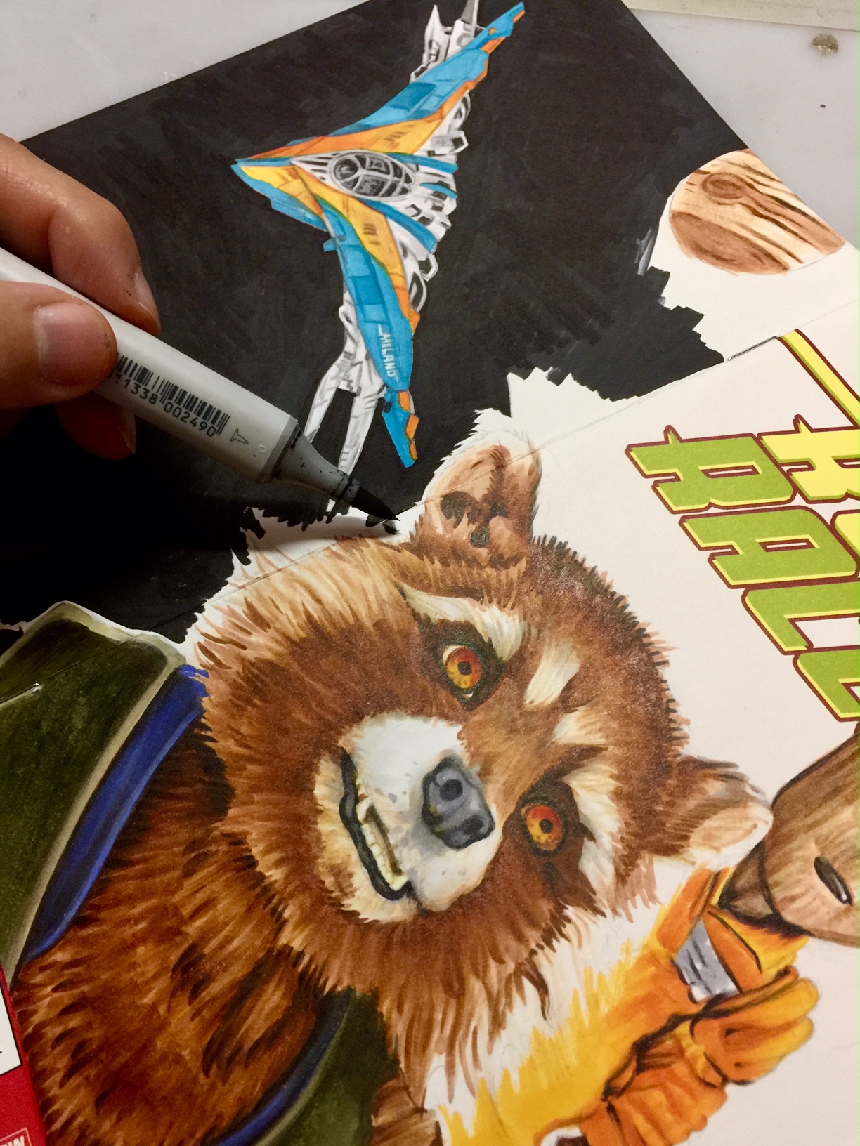 Since I had to draw part of Groot’s head through the masthead I used a bit of Copic White and a brush to block out some of the logo. I then started rendering both characters with brown and beige Copic markers.
