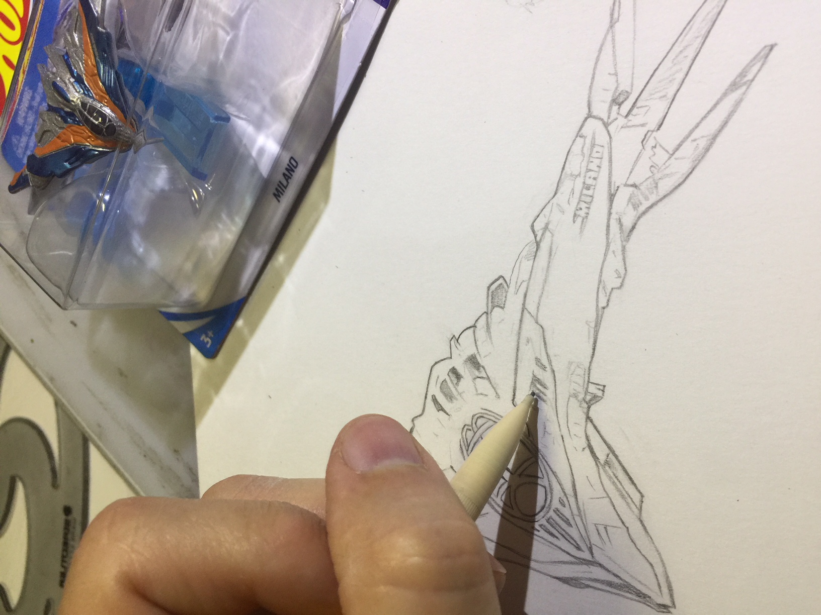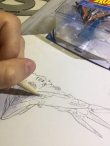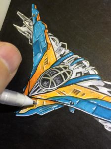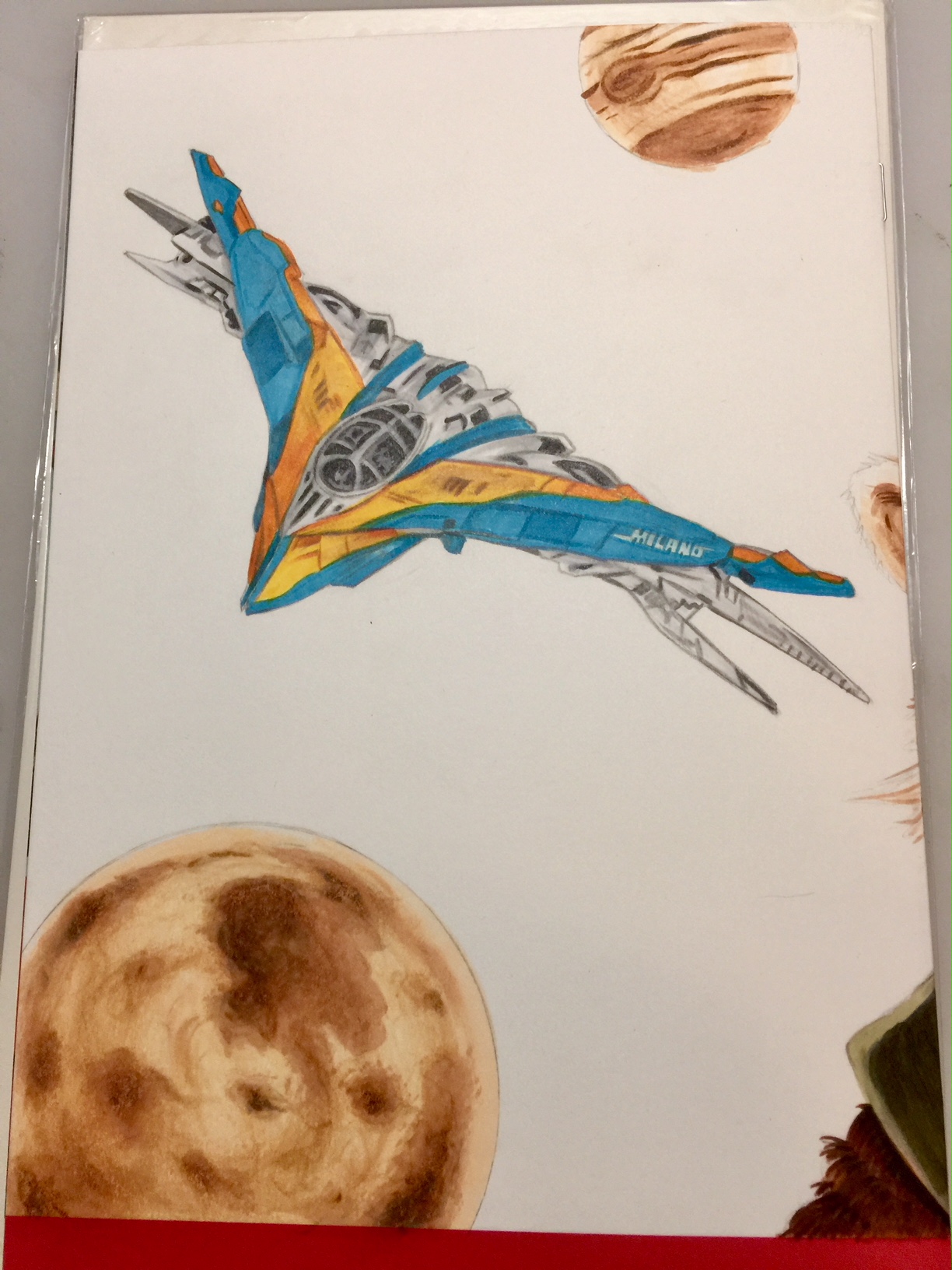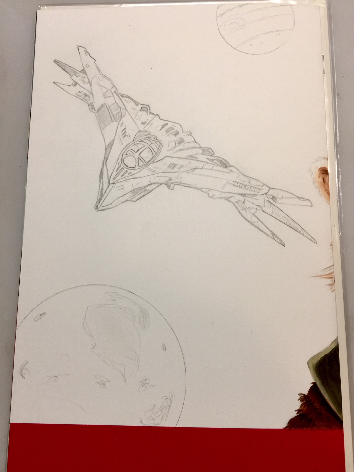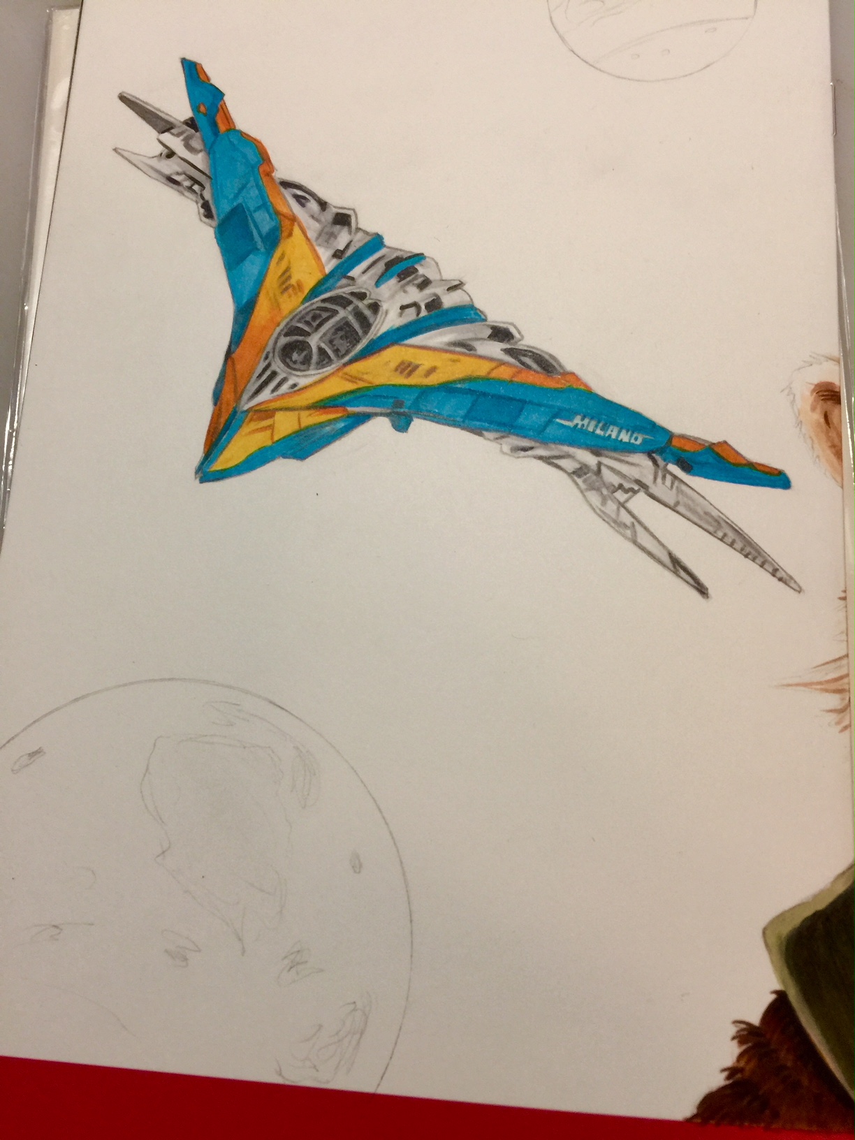 Once I got the guys pretty well rendered out, I then started working on the back of the sketchcover. I had a bit of a hard time finding decent reference for the MILANO spaceship– most online were a bit blurry and didn’t show a lot of detail. I did have a Hot Wheels of the ship handy, and that helped me fill in some of what I couldn’t make out. The rest of the details I couldn’t determine I just made up.