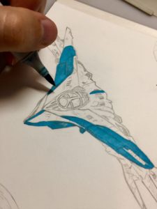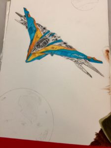 I decided to add a couple planets to the drawing. I then started filling in the teal blue on the ship.