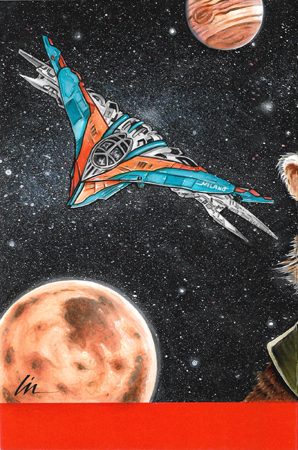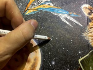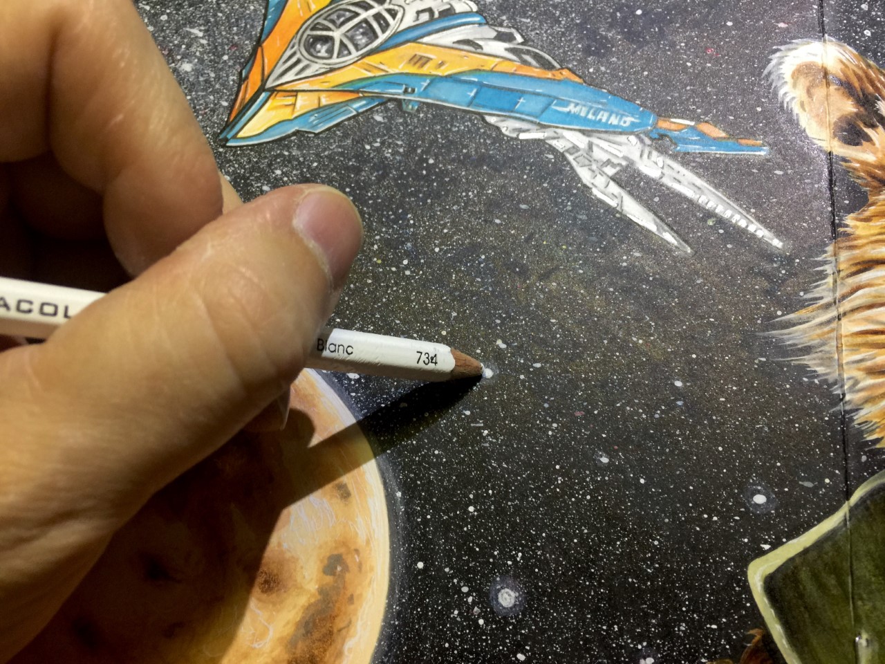 Once I had the star field down, I used a Prismacolor white pencil to add some glow to some of the stars, as well as to some more highlights on the planets, ship, and characters.