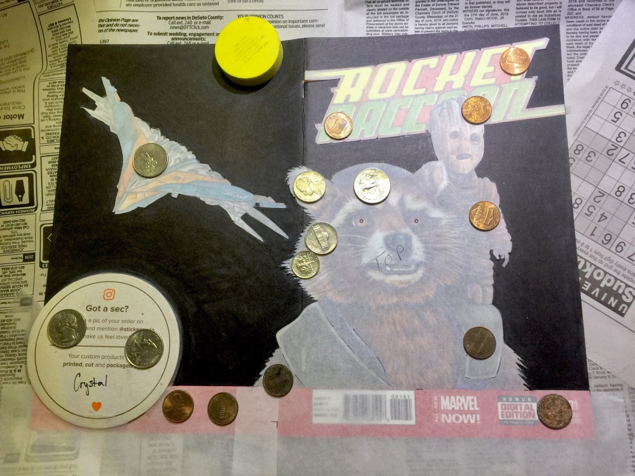Next I used some grays, blues, and greens to Rockets face and outfit. Took another coat or two of markers to help hide the logo behind Groot’s face.