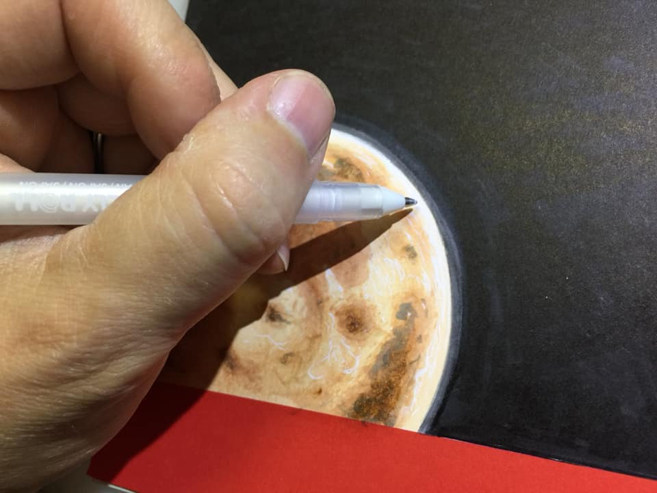 I cut the traced shapes out and placed them on the comic. I placed the same round eraser and coaster down that I had used for the planet shapes on the drawing. I helped hold everything down with a few coins here and there.