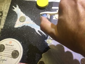 I used a toothbrush and some Copic White to splatter the stars onto the comic. It took a bit of experimentation to get the white consistency down right. I made sure I put down a lot of newspaper under the comic to keep from splattering white onto my drawing surface. Unfortunately I didn’t put enough down, and ended up getting a bit on the TV on my desk. Thankfully it cleaned up easily.