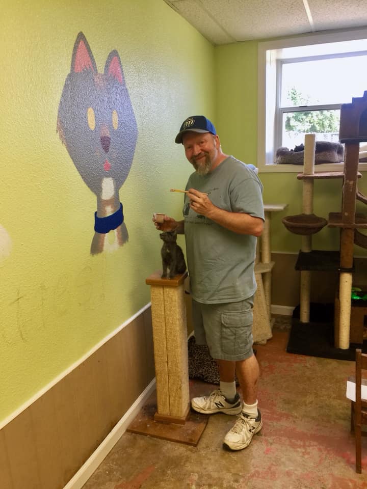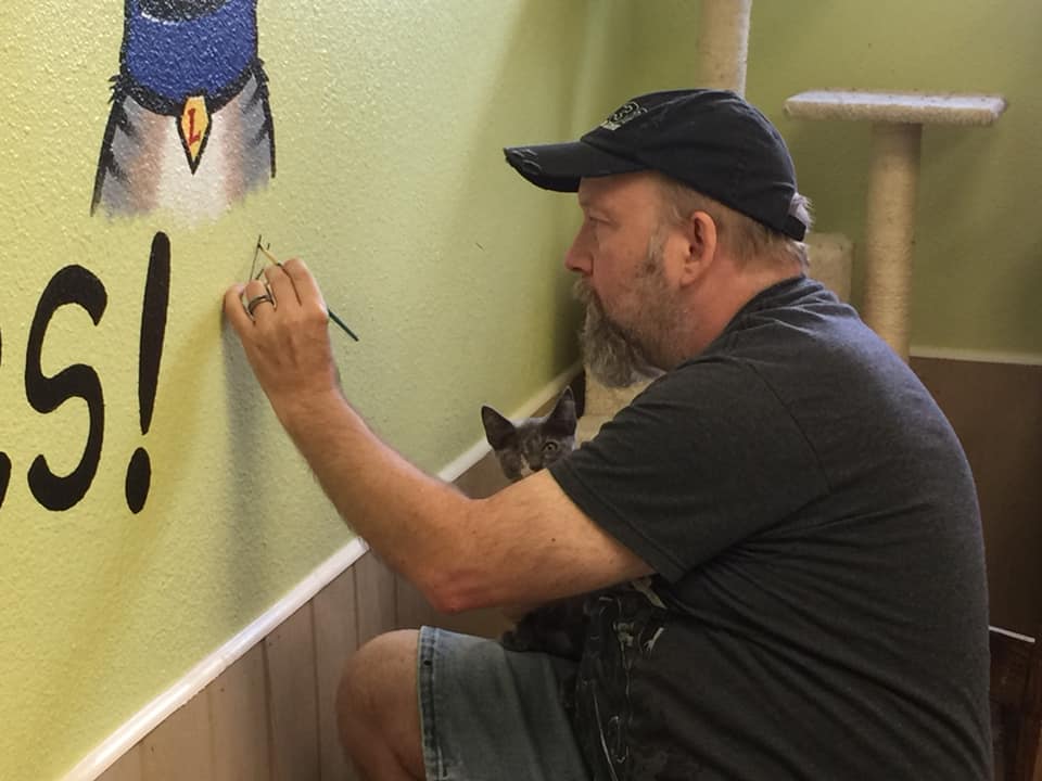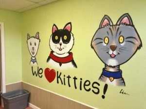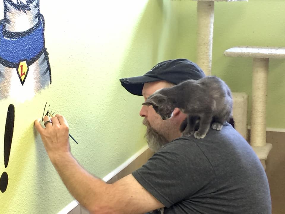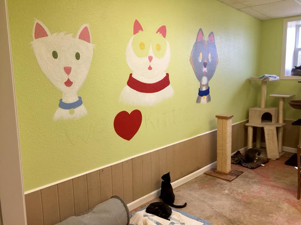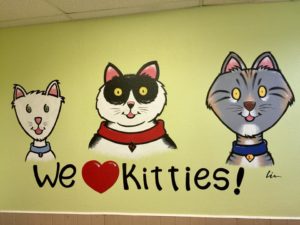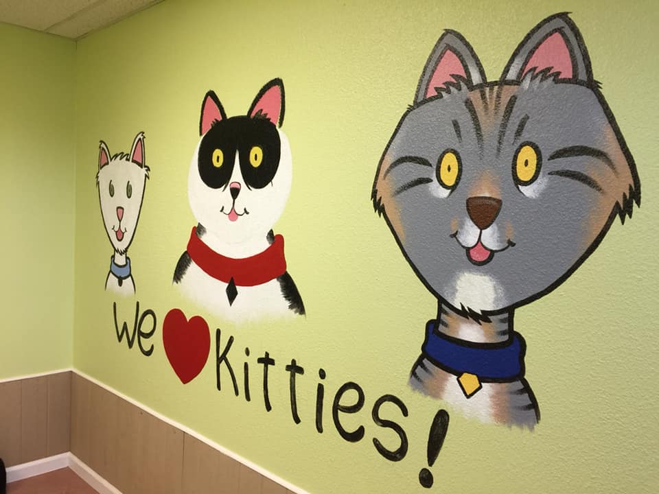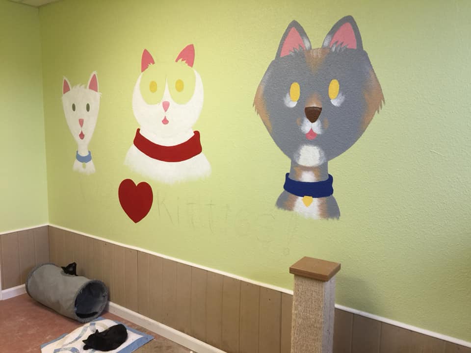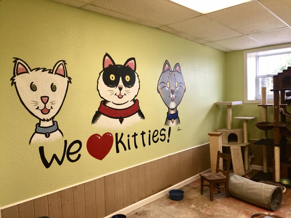 The director of this no-kill animal shelter had posted on Facebook that they were looking for any artists interested in helping paint any murals in their recently expanded cat room. My sister-in-lay Teresa tagged me in a reply. I responded, and made arrangements to make the trek down to Tunica. Thanks to the casinos being down there, the roads are much better these days and the trip doesn’t really seem any longer than my normal trip to work each day- actually there was a lot less traffic.