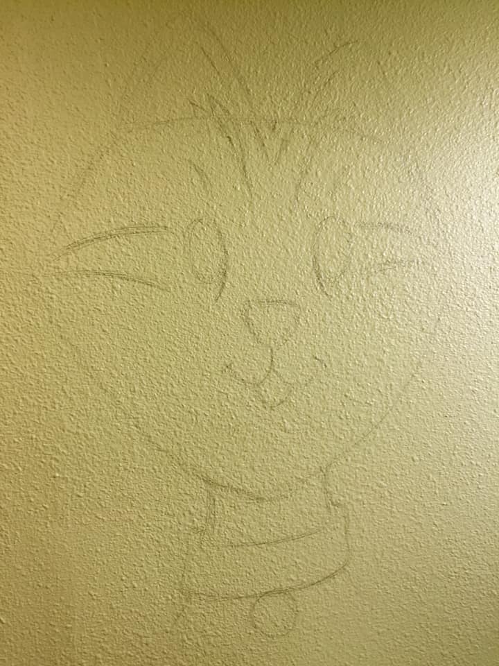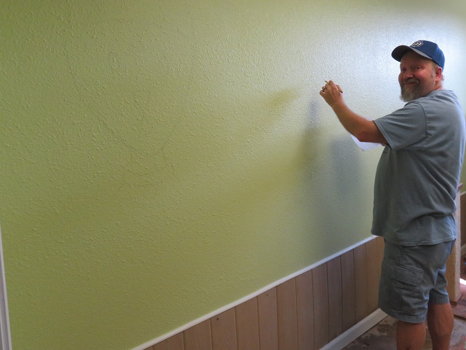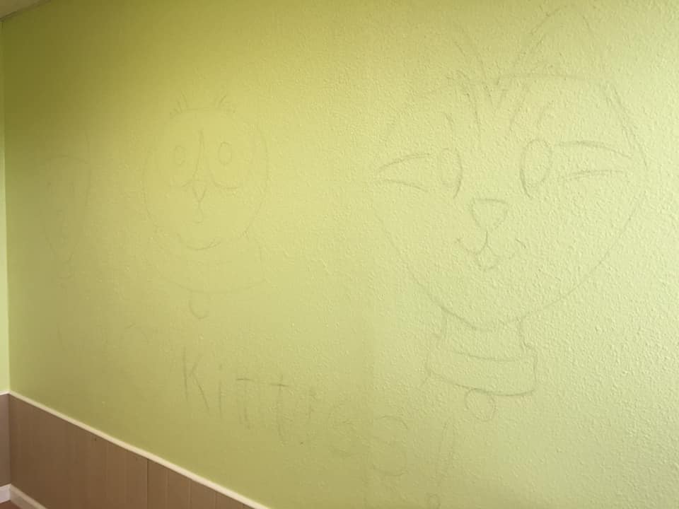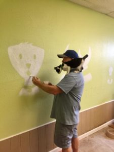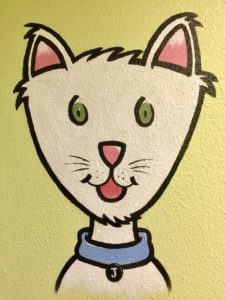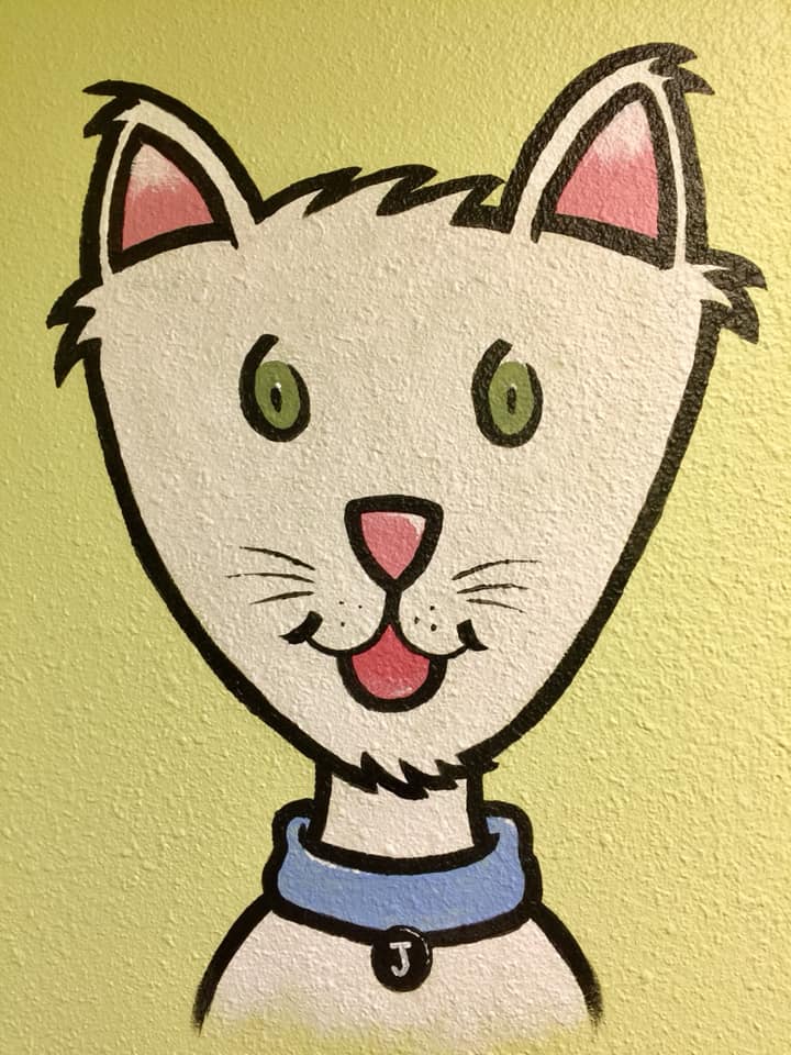 Sandy, the director said she didn’t have any specific things she wanted, but said she liked butterflies and grass. I showed her some cartoon sketches I did of my cats and asked if we could do something like that, and maybe a phrase under it. She was good with that and we picked out the spot on the wall for it.