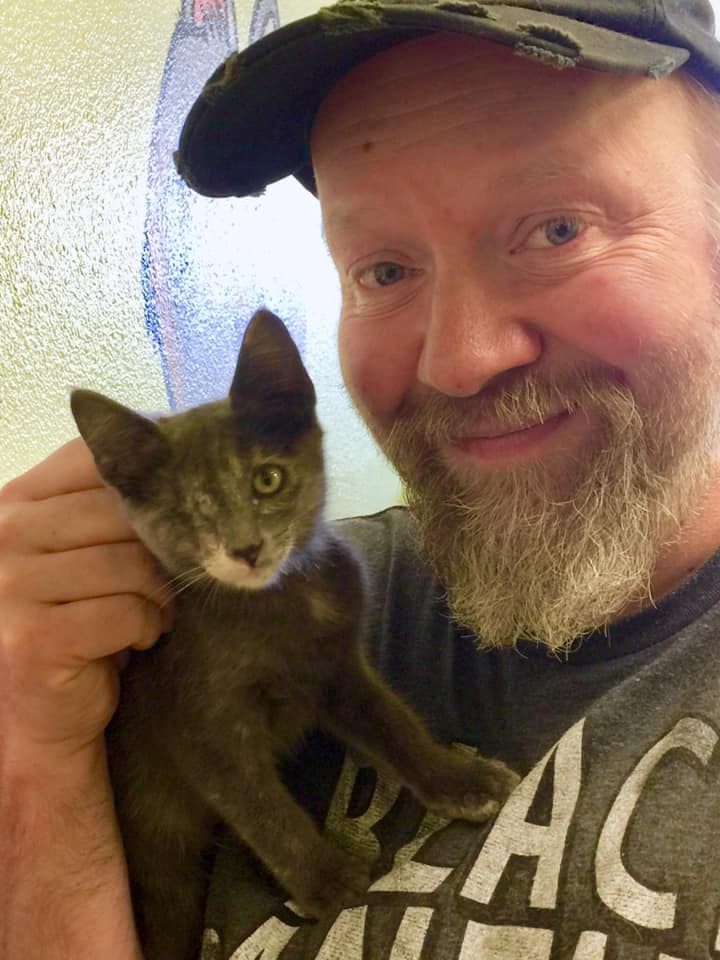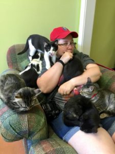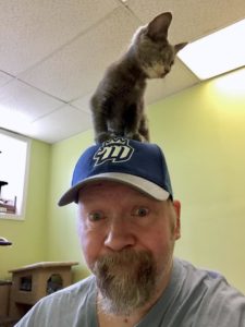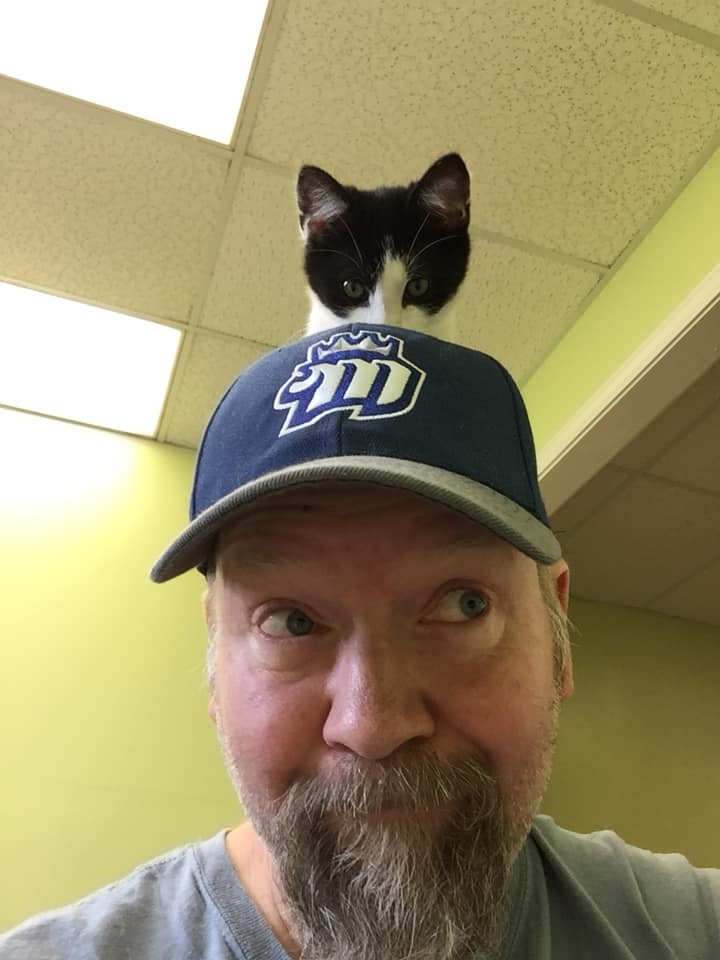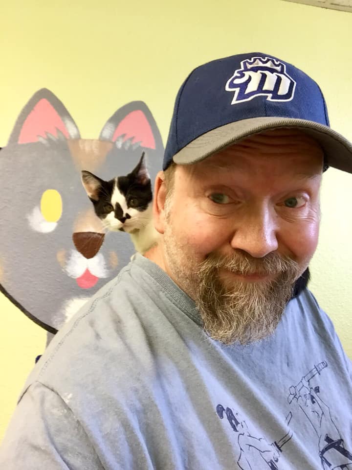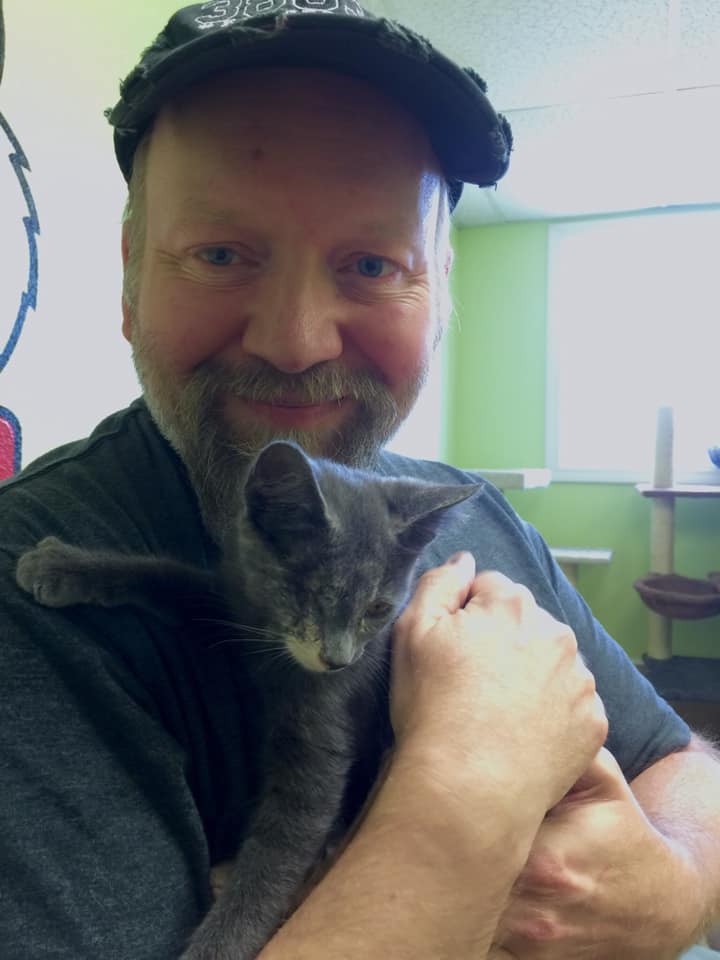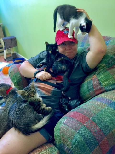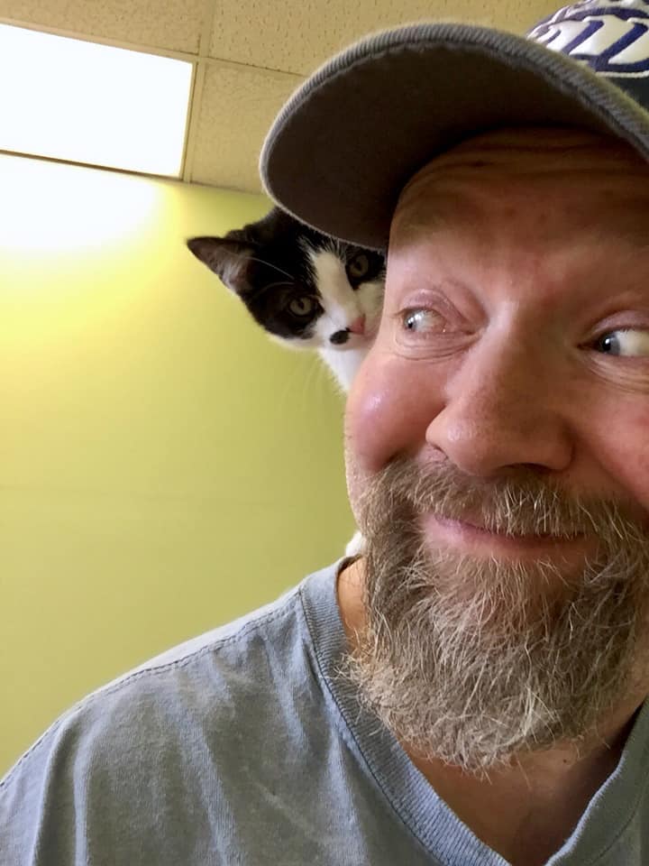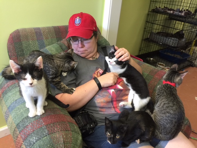 There was a photographer there in the morning to take pics of the cats so their profiles could be loaded up to PetFinder to help find them homes. As I worked the kitties continued to come and inspect my work, and snuggle. A couple loved nuzzling in my beard- much like my boy kitty Lex has did when I first met him. He hasn’t gotten too big to want to nuzzle, but he seems to have outgrown wanting to be held most days- he’s more of a head-butt kinda guy now. It was nice to have interaction with tiny kittens again. (That’s Sneezy on my shoulder.)
