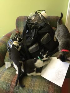 That following Saturday my wife Nicki decided to travel down with me the next trip. We got there just as the kitties had been fed breakfast, and as soon as Nicki sat her camera bag down on the comfy chair it was covered in cats just like my bag had been.