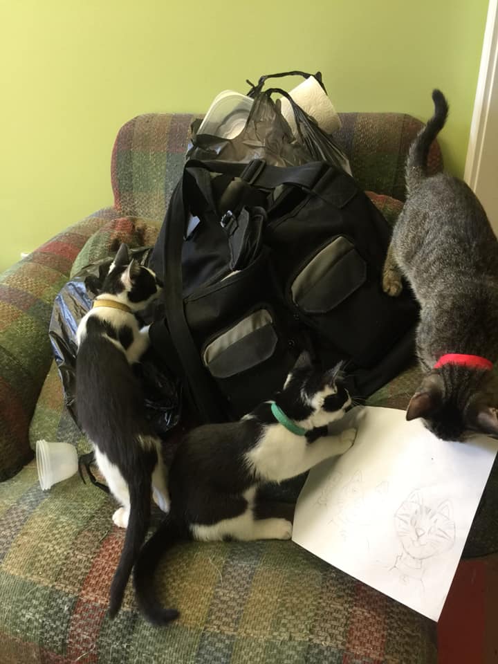I had put my art bag down on the overstuffed chair they had along the opposite wall. The next thing I knew kitties were all over it sniffing and inspecting, and my roll of paper towels were on the floor being a new scratching toy for some. I moved it all to the top of an empty cat kennel cage along with my other painting supplies. A few seconds later two kitties were on top of the 4ft tall cage and meowing at me. These two (a girl and a boy) would be a couple that really wanted my attention while I was there.