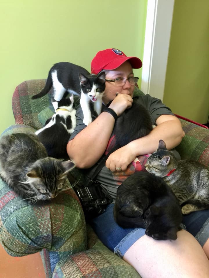 After she moved her bag and sat down it wasn’t long before she was covered in kitties (that’s Happy with the half mustache, and Beans on the chair arm in the left pic- think the other tuxedo is Dopey).