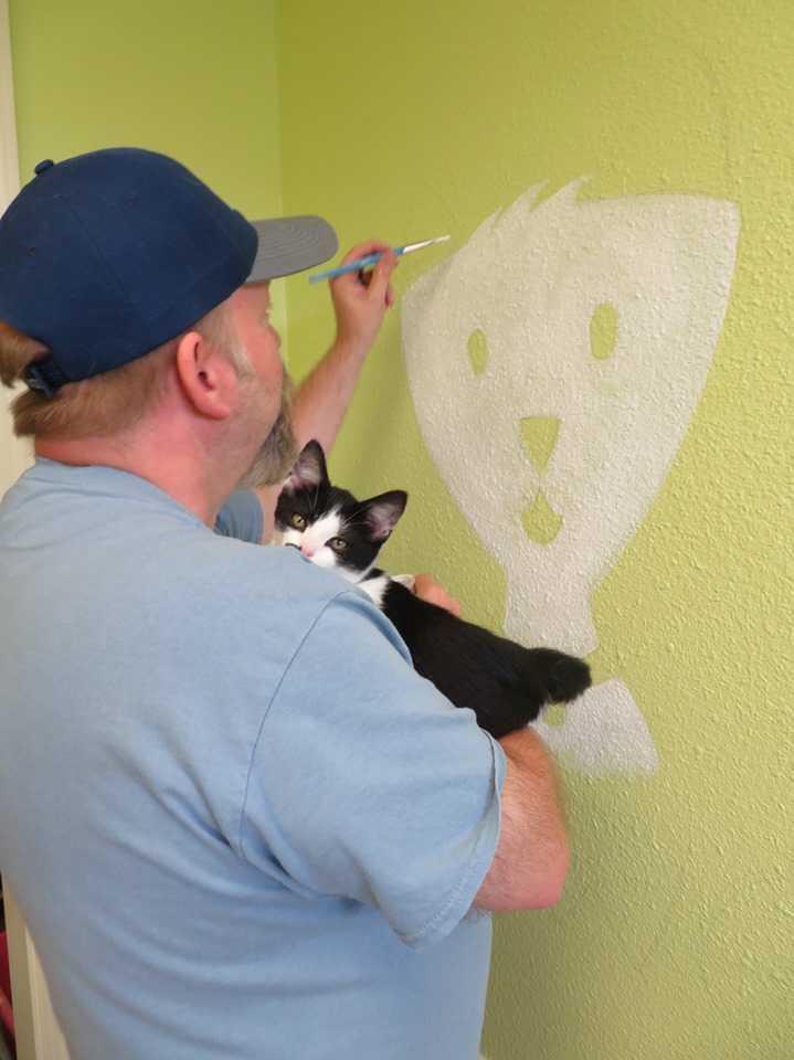 The two partners in climb took turns using me as a human cat tree as I began to sketch the cat heads out on the wall. They really liked just hanging out on my shoulders…