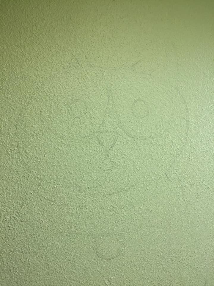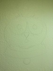 Since the kitties have the run of the room and it’s not very wide, it would have been a pain to set up my projector- and honestly quicker to just draw it. The wall had a bumpy texture to it, and was a bit glossy. It made it tricky to sketch on and later do sharp outlines in paint. It took a couple coats of each color to cover, and I had to be careful of runs.
