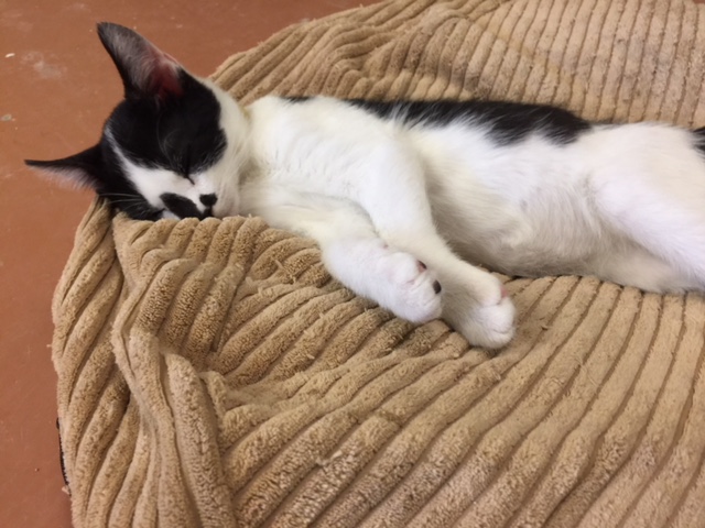 There were a few cat trees they could climb or sleep on as well. That’s Dopey chilling in the cat tree. He was not feeling great Sunday, but was very playful and lovey the next time I saw him. Another sweetie.