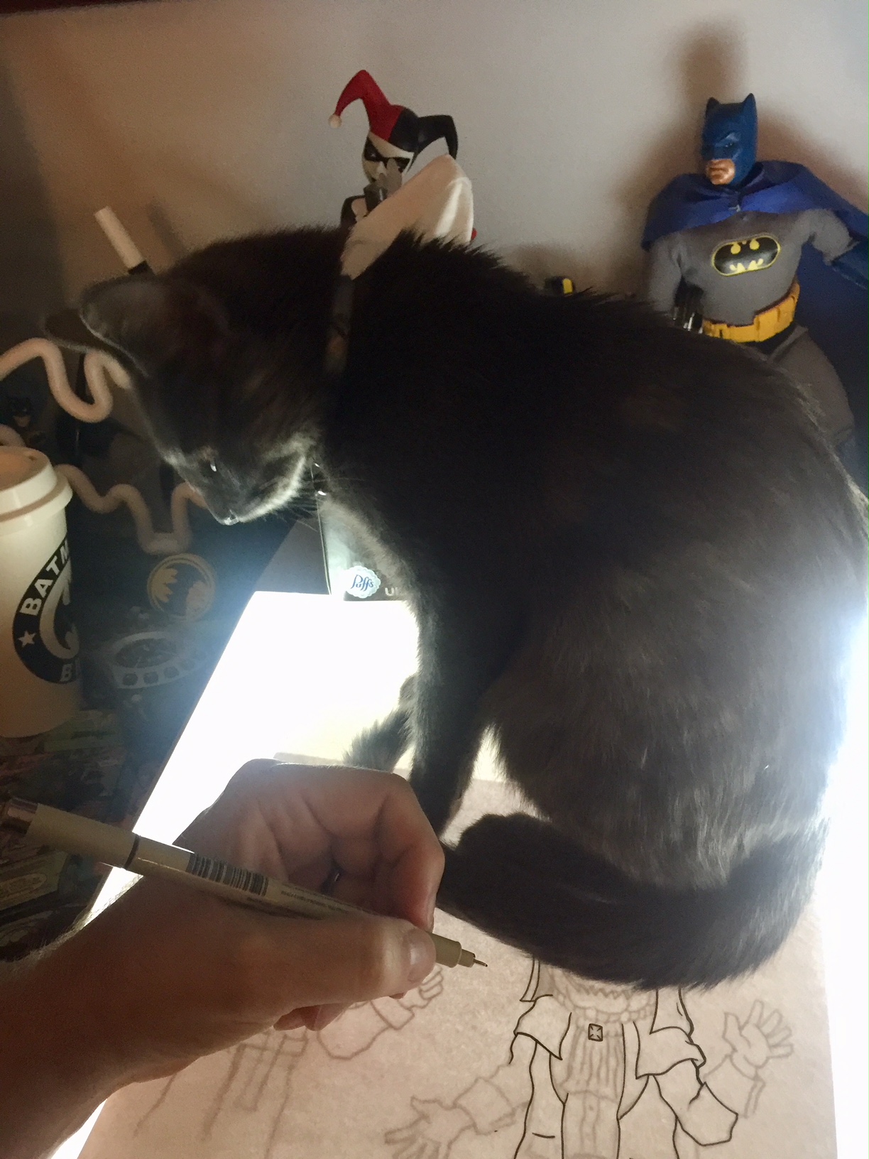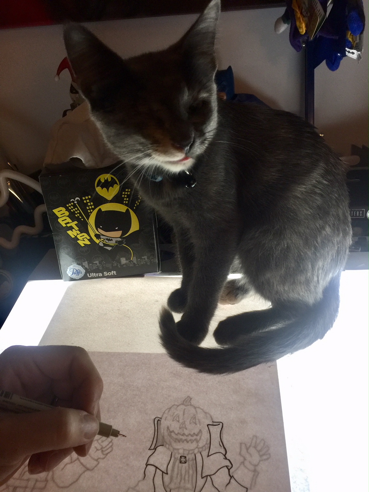 Next I had to draw a couple new “Scared Silly” toons for the zine. My kitty Lena tried to “help” me…