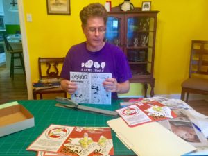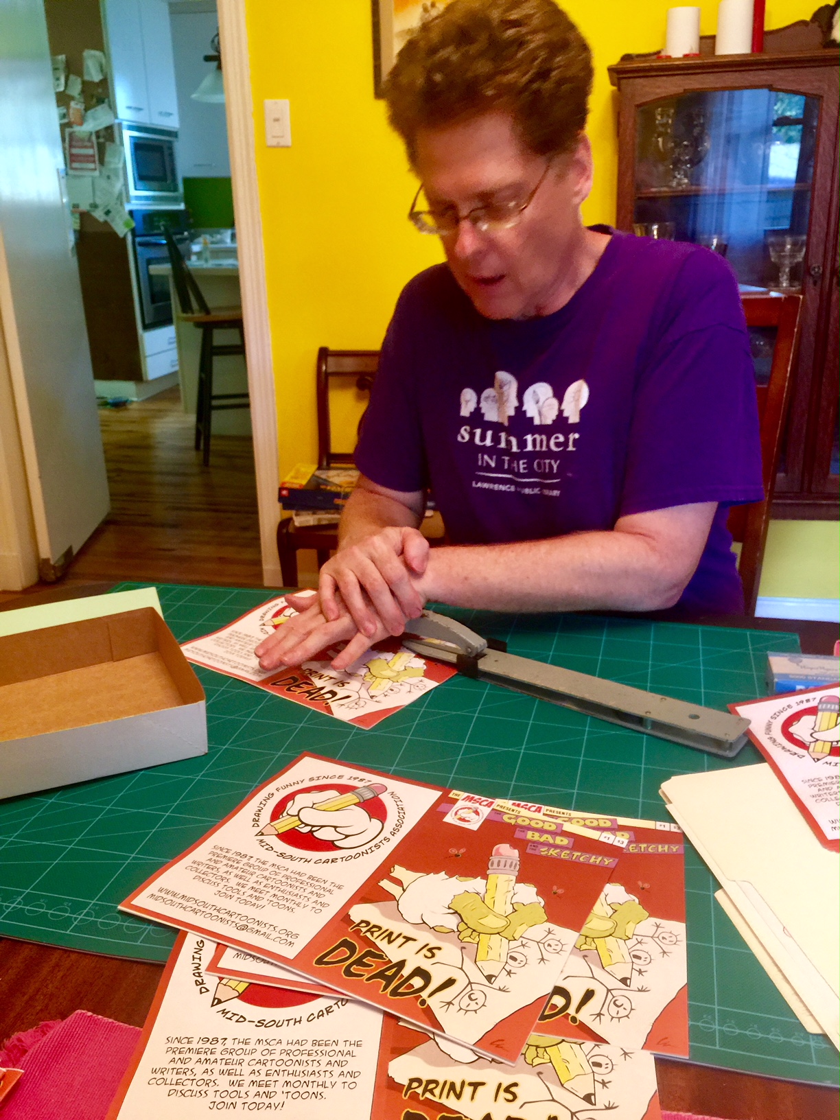 Dale would group the pages together in the correct order and staple them, and I would fold them. Each MSCA member who participated got a copy for each page they submitted, and could order extra copies if they wanted. They went together fairly easily. We plan on doing more quarterly, and our next issue’s theme is “out of this world“. I’ve got some ideas of new space/alien toons, and will probably submit at least one or two older Scared Silly and Have Geek Will Travel toons, too.
