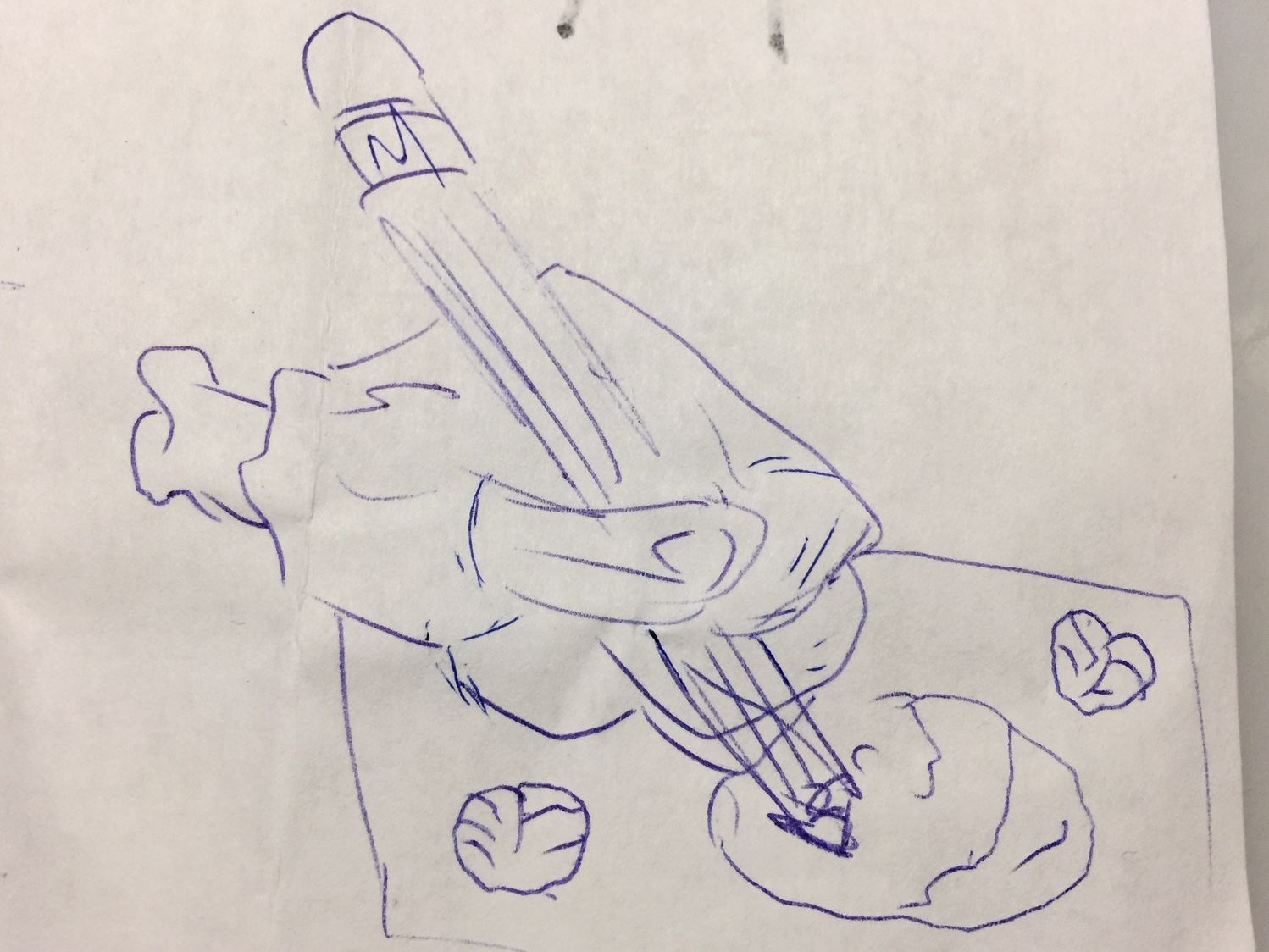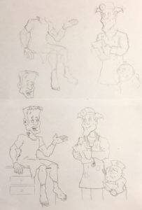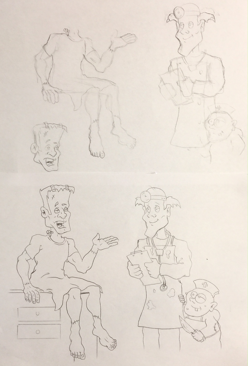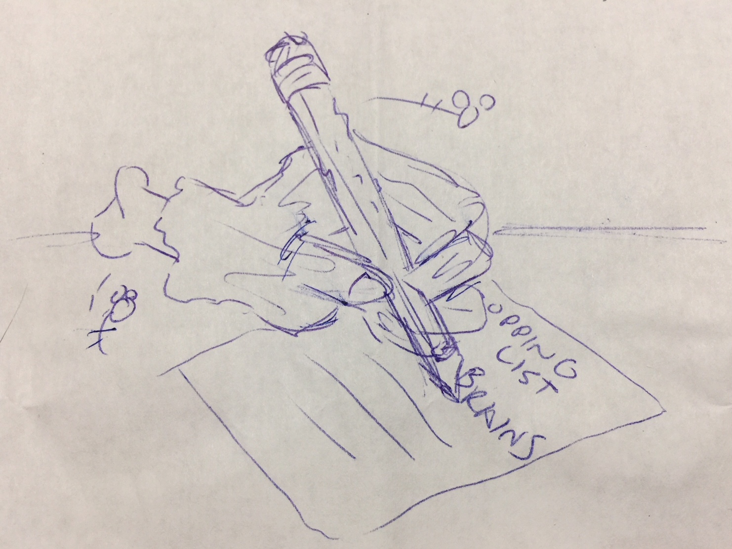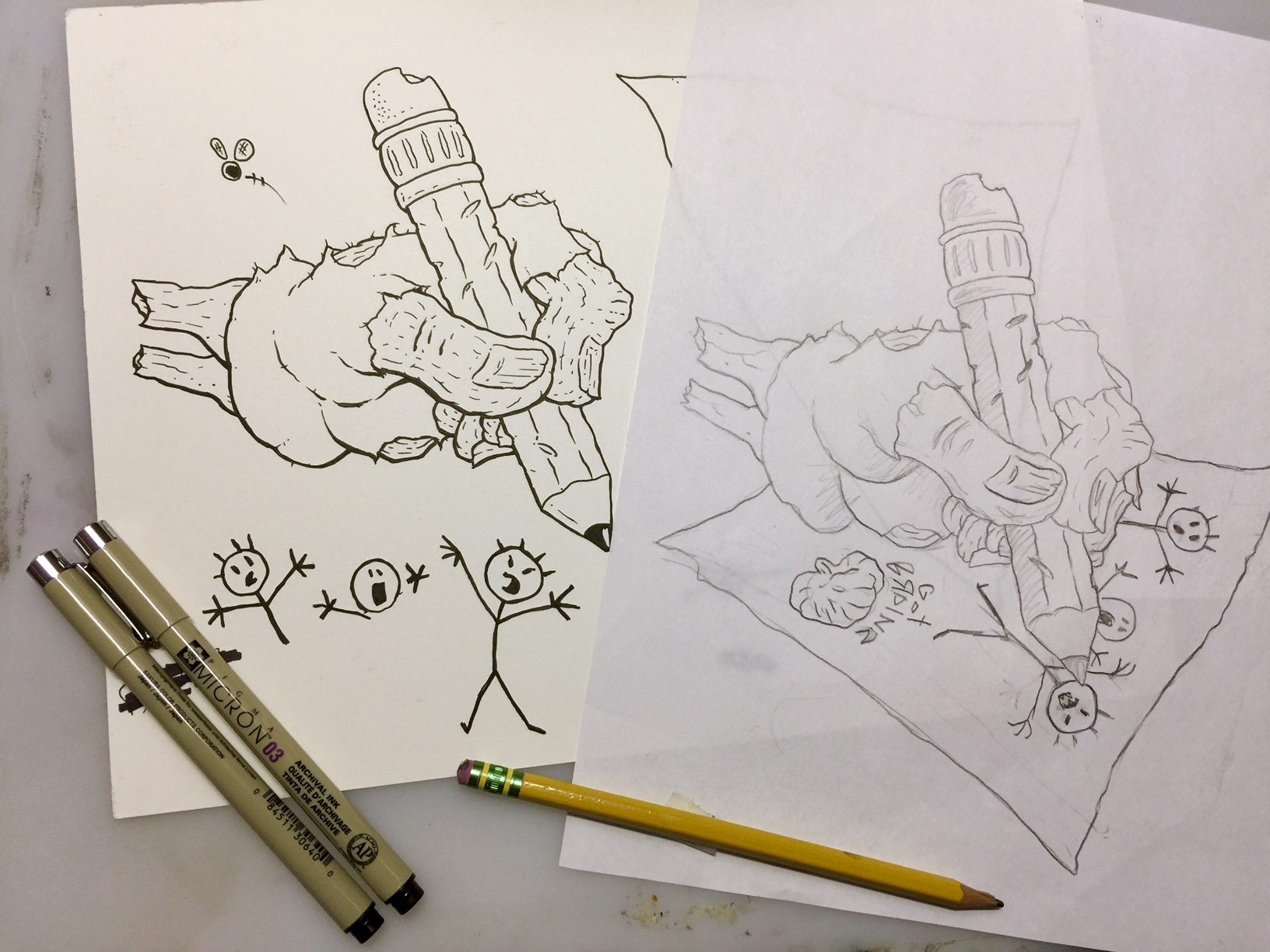 They dug it so I started on refining the drawing in pencil next. I usually just use a yellow #2 pencil on copy paper at this stage, and use my lightbox when needed. I ditched the shopping list and brain doodles on the paper ideas, and just went with some simple stick figures.