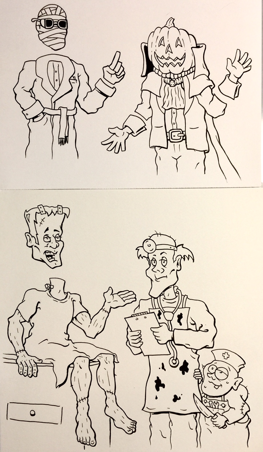 Like the cover art, I penciled these, then lighboxed them to get the inks done. Decided to ink the Invisible Man and Frank’s heads separately in case I needed to re-position them a bit once in the computer…and I did have to.