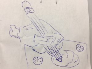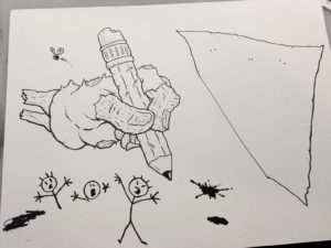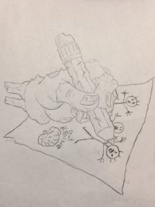 I like to draw the image in pieces in case I need to edit the art. Much easier to scale and move the pieces around to make a better fit on the page, as well as color my line art. Then I scan the art into my computer. I just have a small HP scanner/printer so I try not to work on paper bigger than 8.5″x11″, otherwise I have to scan it in sections.