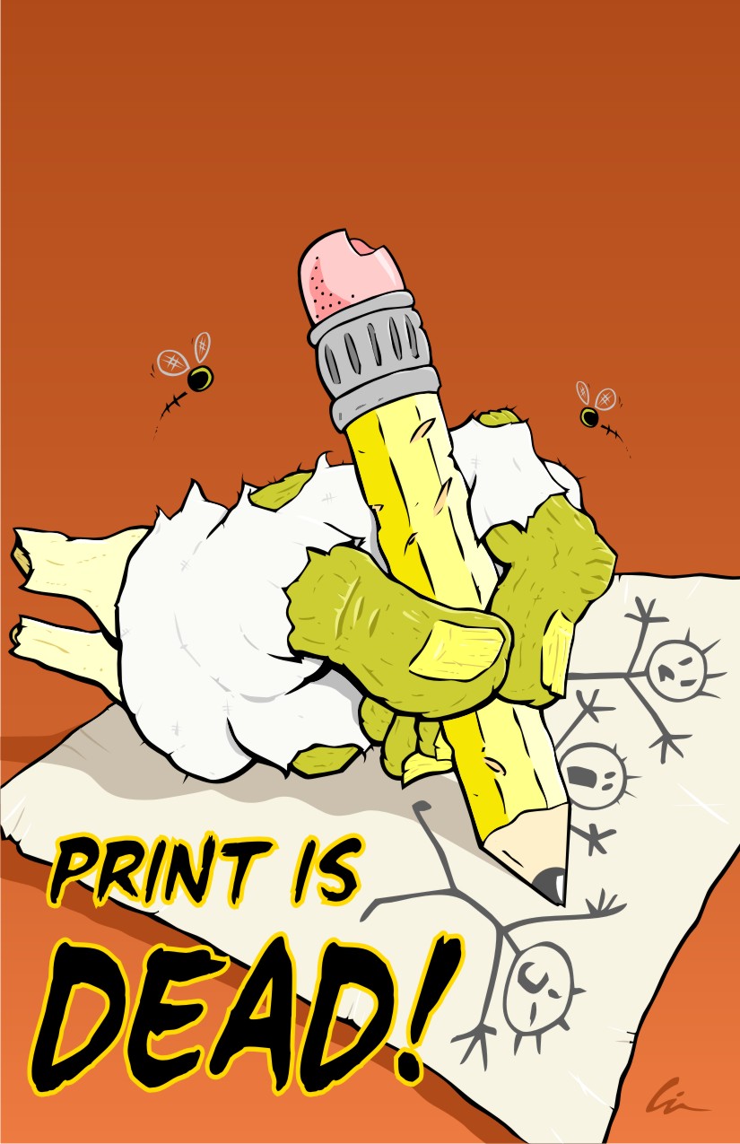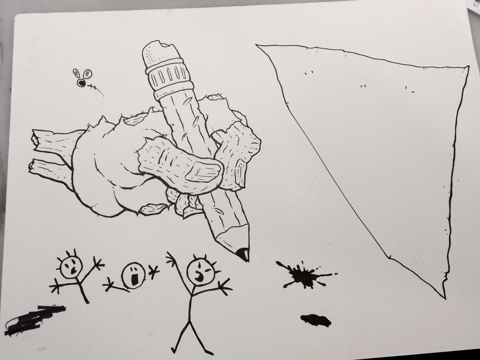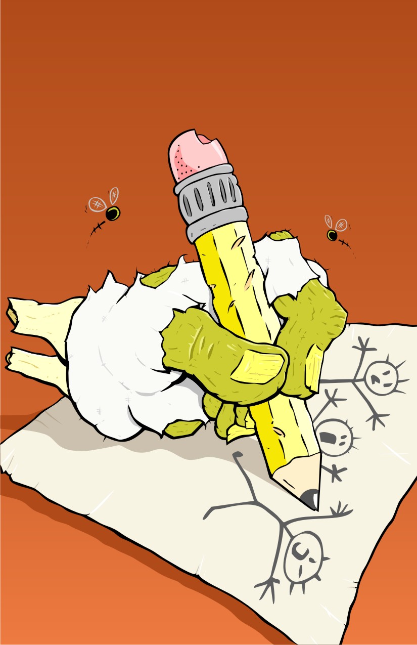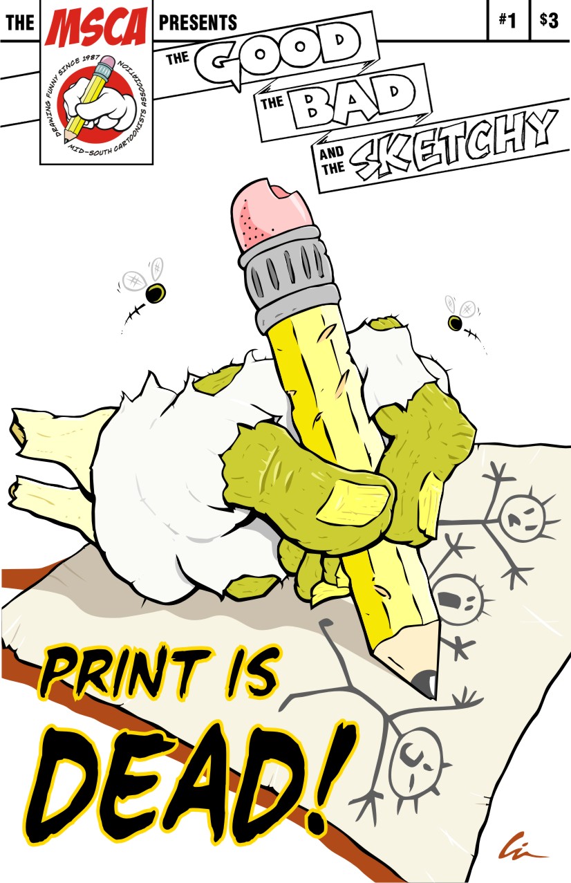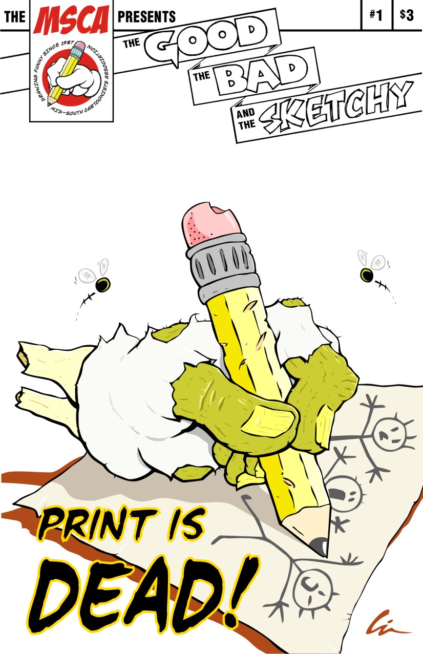 I had an idea for a take off on our MSCA hand/pencil logo and volunteered to do the cover art. I did a couple of rough thumbnail sketches of the zombie hand and sent them off to the guys to get their opinions on the layout.