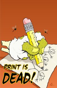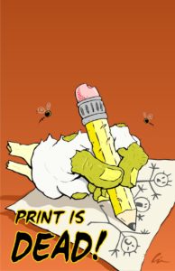 I used Corel Draw, and convert the scanned pixel image into vector art for it using Corel Trace. It changes the b/w pixel image into editable line art with points. I can then adjust/clean up lines, color, add a background, typeset, and piece the whole image together. Dale had sent me a template image with a masthead logo he created for me to use for positioning.
