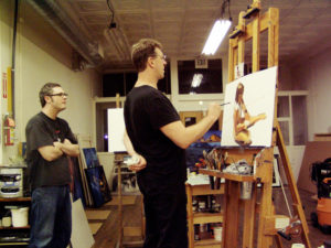 When I had a t-shirt shop and it was slow I would grab a blank shirt and a reference photo and freehand the painting. It kept me in practice, drew attention to what we do, entertained folks passing by, gave me a display to sell, and would shut up the folks who would say I had to have a projector to paint. (BTW- I miss the workspace and my hair, but don’t miss those pants!)