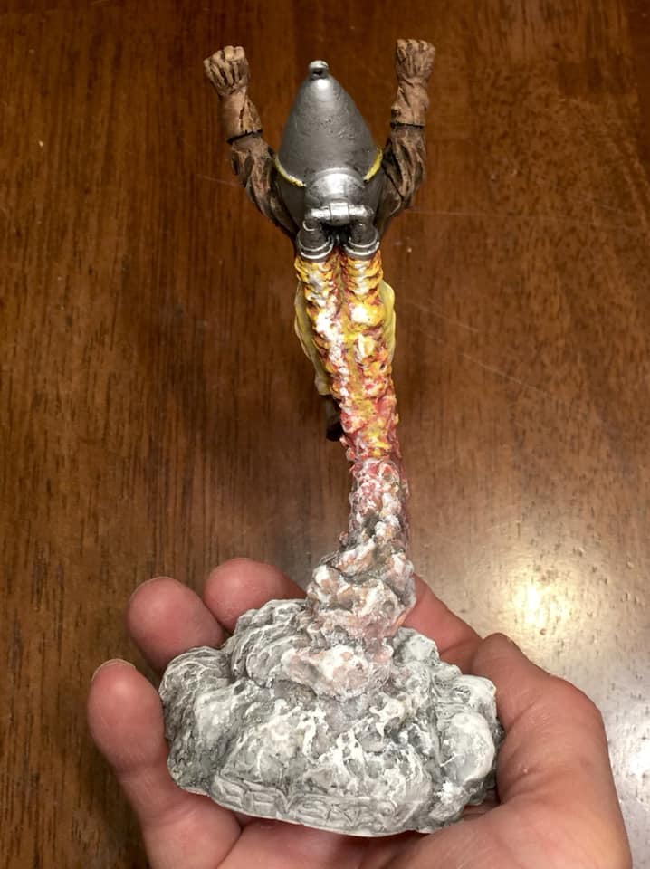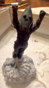 This is a one piece model, so no glue or assembly required- and has its own base built right in. The kit had already been primed by me years ago, so after giving it a good cleaning I started painting it with acrylics. Started withe the billowing smoke base and worked my way up. Found a few small air bubbles here and there as I painted, but they were very tiny and the paint filled them in.