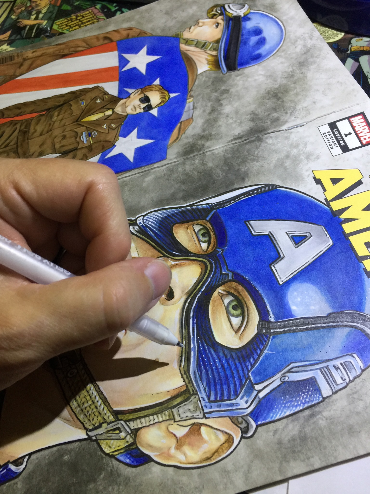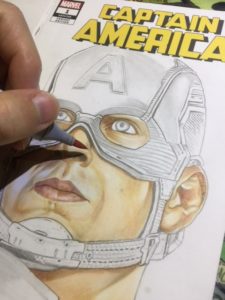 For the 4th of July weekend I got started drawing on a Chris Evans Captain America sketchcover. Drew it on a Marvel Comics blank cover using a cheap BiC #2 0.5mm click pencil. I like it because it has a cushioned barrel and I don’t have to stop and sharpen it.