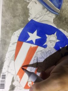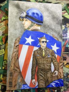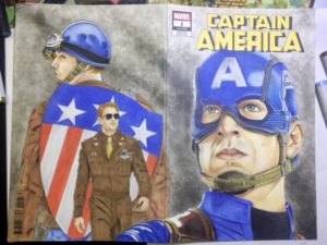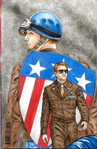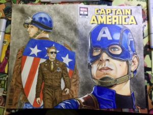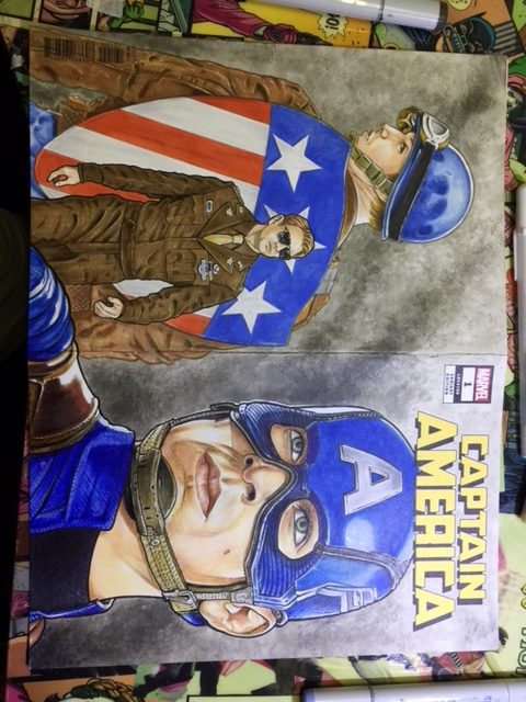 My wife Nicki asked me why I didn’t show more of “America’s Ass” in the drawing…I love Chris Evans as Cap/Steve, but just don’t enjoy the heavy bag/gym scene as much as she does.