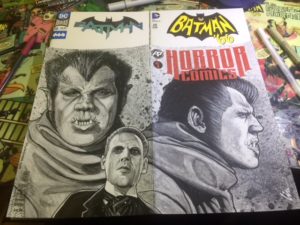 Sometimes I’ll draw a horror sketchcard. Smaller, but still fun and I like working with markers. (I just finished up a MANOS: The Hands OF Fate horror sketchcard set you can see in my last blog post). I can draw these and sketchcovers while enjoying some A/C in the Batcave studio. (You can check out my “The Art Of Robert Aragon” horror sketchcards here.)