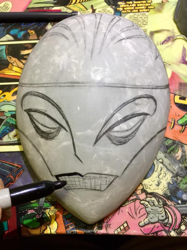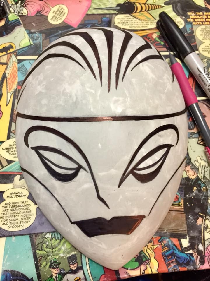 When I had the shape of the mask smooth and symmetrical I sketched out the face details in pencil, and then filled those in with black Sharpie marker.
