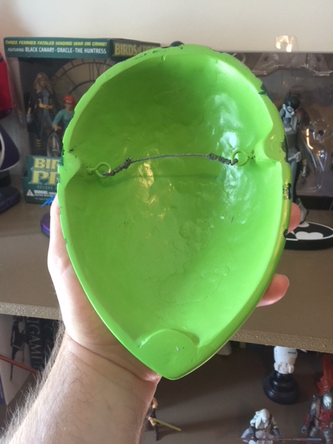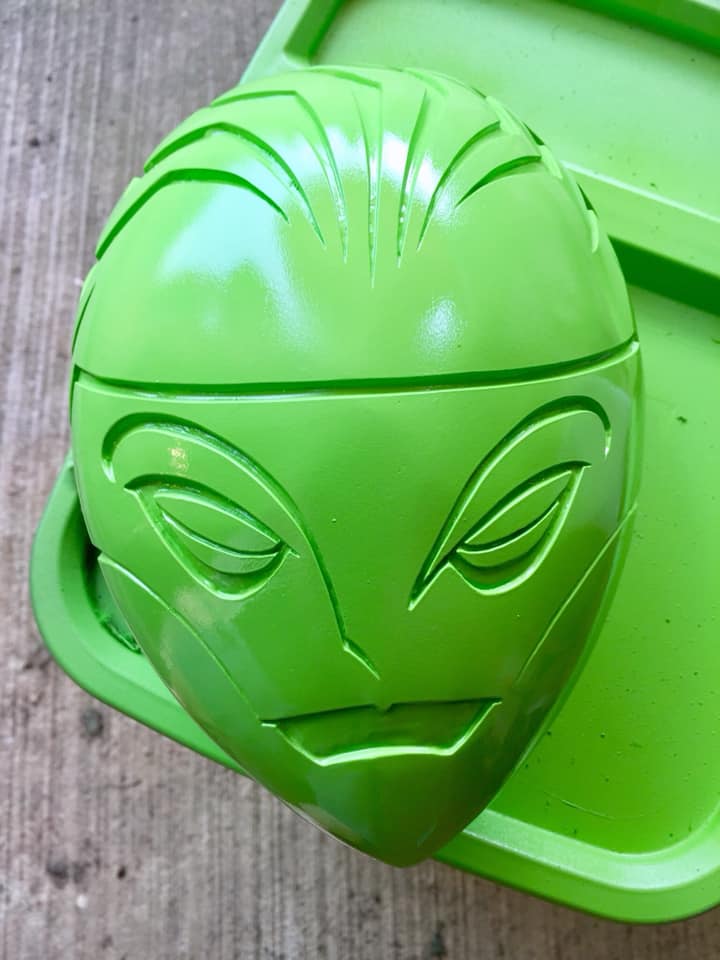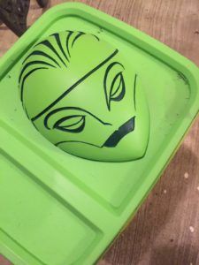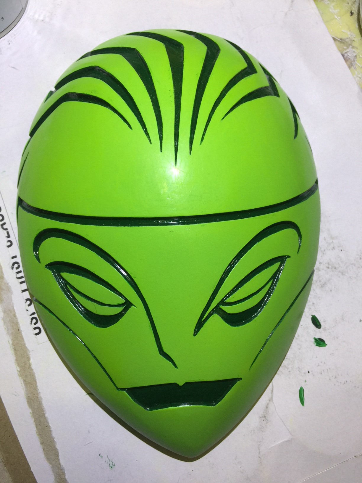 I washed the carved mask really good with soap and water, let it dry, and then sprayed the whole mask with neon green spray paint/primer. It took a few coats and I found a few areas that needed a bit more sanding. So I sanded, rinsed, let dry, and then took it back outside to paint again until I got a coverage I was happy with.