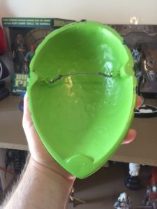 Once the mask had set overnight to dry I painted the recessed areas dark green with a small paintbrush by spraying the darker paint in its cap and brushing by hand with the detail brush. Had a few “Oops..!” moments while using the paintbrush, so once the paint was dry I did some light sanding to remove mistakes. I then did a light sanding over the whole surface with the fine sandpaper, rinsed it, and let it sit overnight again. The mask had to be light sanded for the next step…