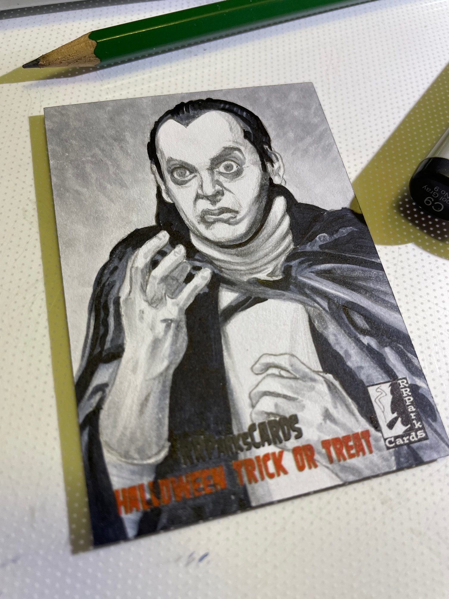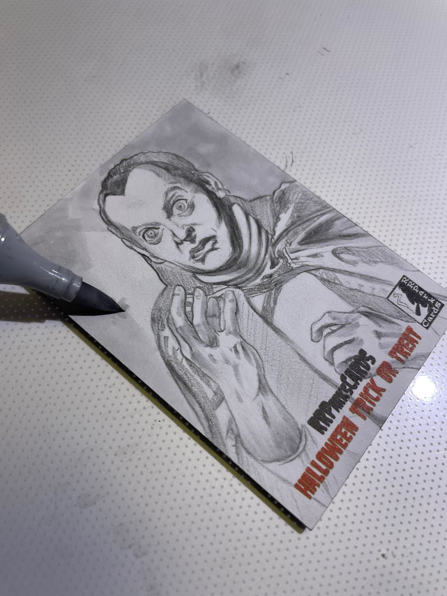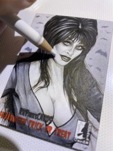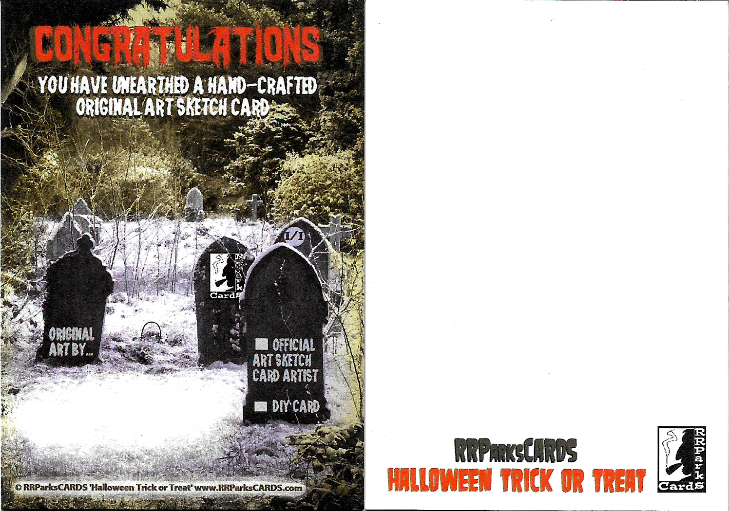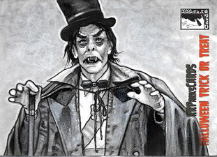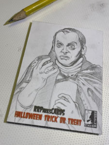 I’ve also been working on Zorro and more Ultraman sketchcards for RRParks Cards– as well as some for their upcoming “Halloween Trick Or Treat” set. The Zorro and Ultraman cards I can’t show just yet- waiting on approvals, but I can show you the Halloween ones. I wasn’t given any real directions on what to draw, other than it be Halloween related and to just have fun.