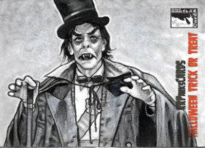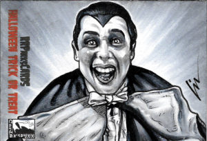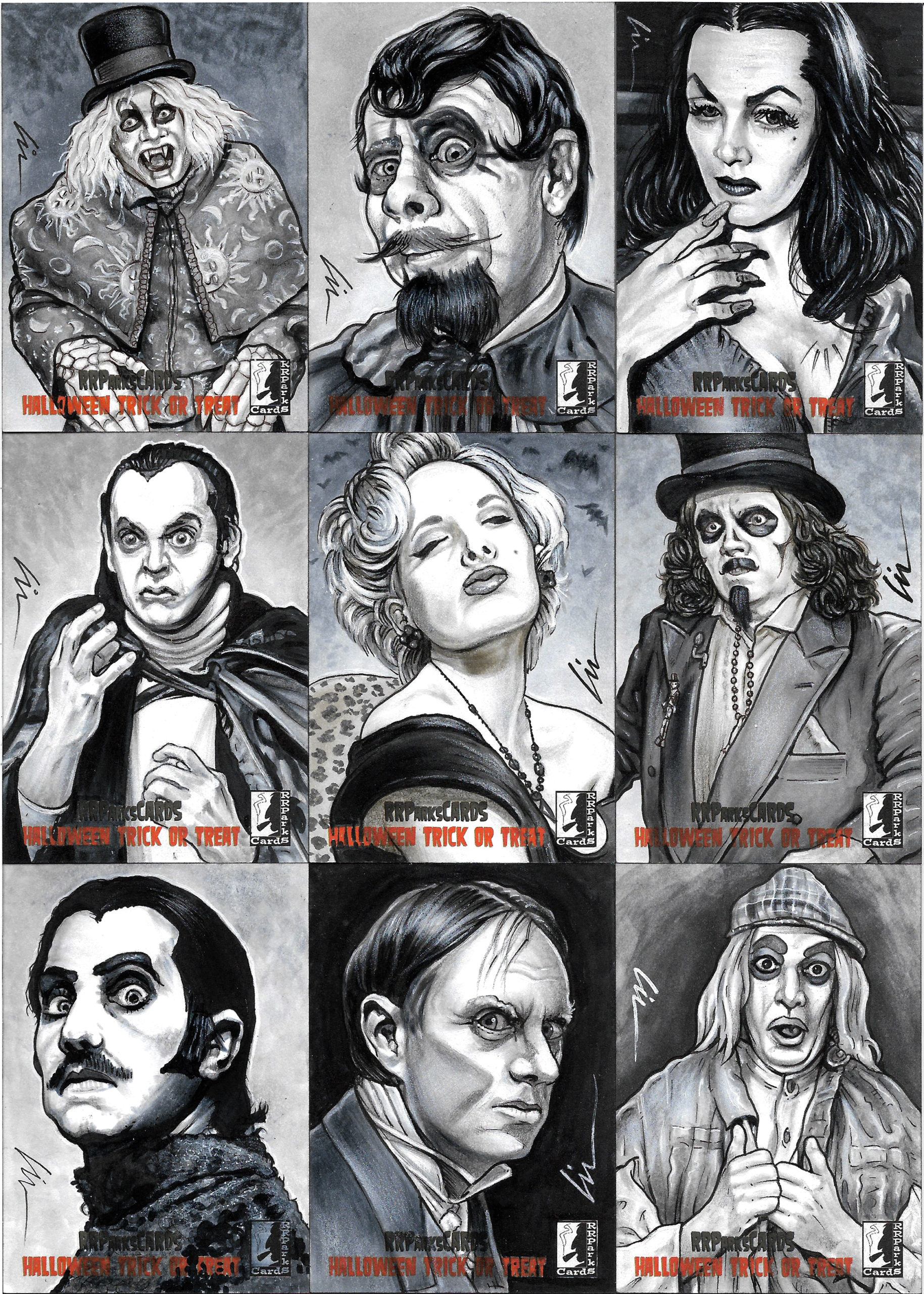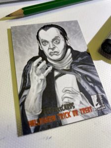 I decided to focus on horror hosts/hostesses as my subjects. I did ten sketchcards for the set, including well known fan favorites such as Svengoolie and Vampira, but also Count Scary, The Cool Ghoul, Zomboo, Zacherley, Count Gore De Vol, Sir Graves Ghastly, plus some of my favorites like SIVAD, SCTV’s Count Floyd and one I’ve actually met (twice), Jami Deadly.