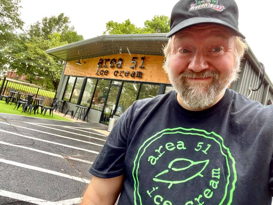 First up, you may/may not know I got laid off this summer from my printing day job. Since most of what we printed was event and school related orders, COVID had caused printing orders to slow to a trickle. I was able to pick up a part time job working at Area 51 Ice Cream scooping ice cream- it’s a day or night gig depending on when they need me. They’ve closed the Crosstown location in Memphis (foot traffic has really slowed), but the newer/larger location is still on Commerce Street in Hernando, MS (across the street from the original location near Church Park) and is thriving. It’s within walking distance of our house, so I don’t have to risk my life driving on I-55 and 240 every day. My commute by car is actually about the length of a pop song now. I’ve also working on some new tee designs for them and will post those later. I’ve actually had a couple folks recognize me at work from my online art posts.