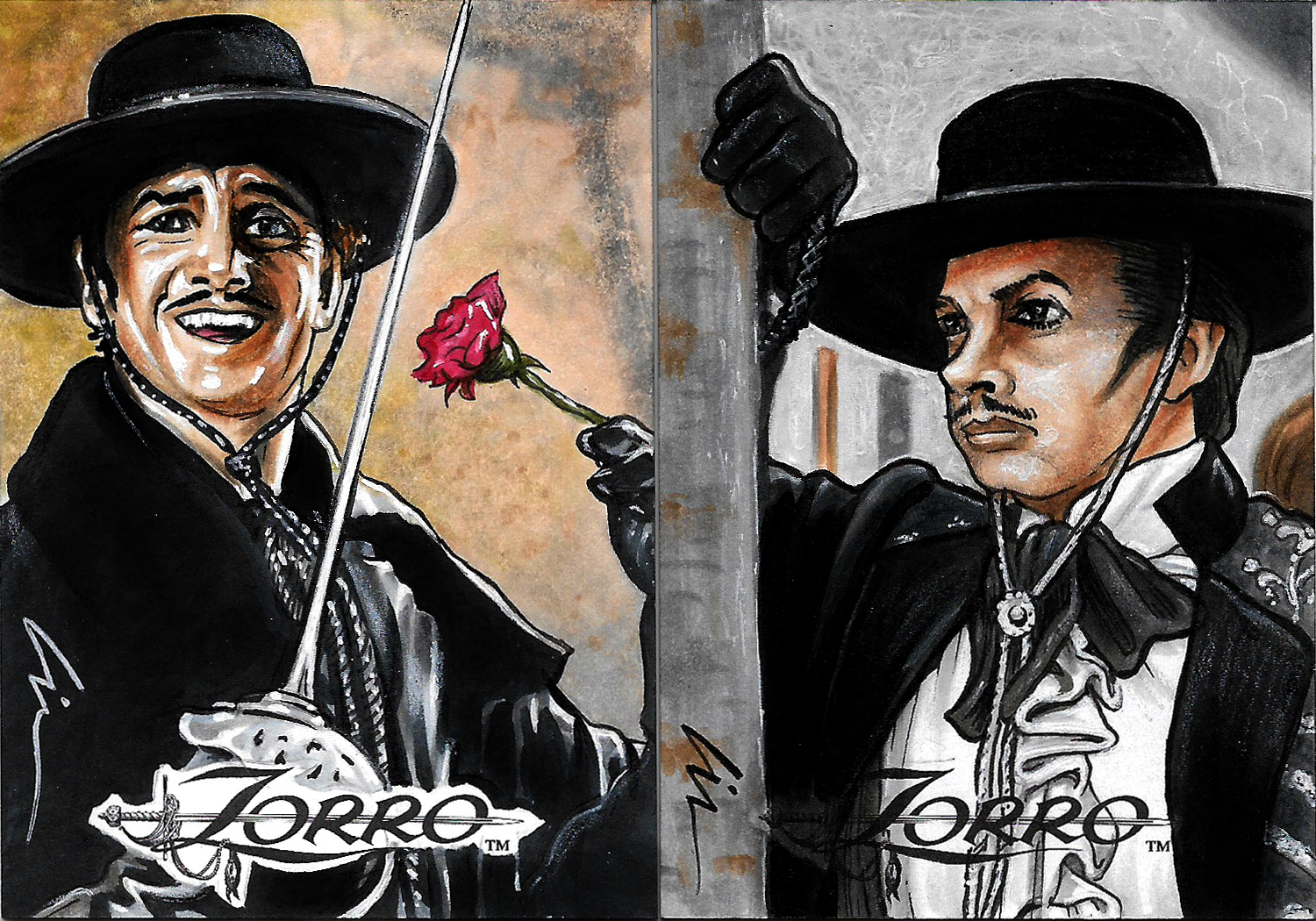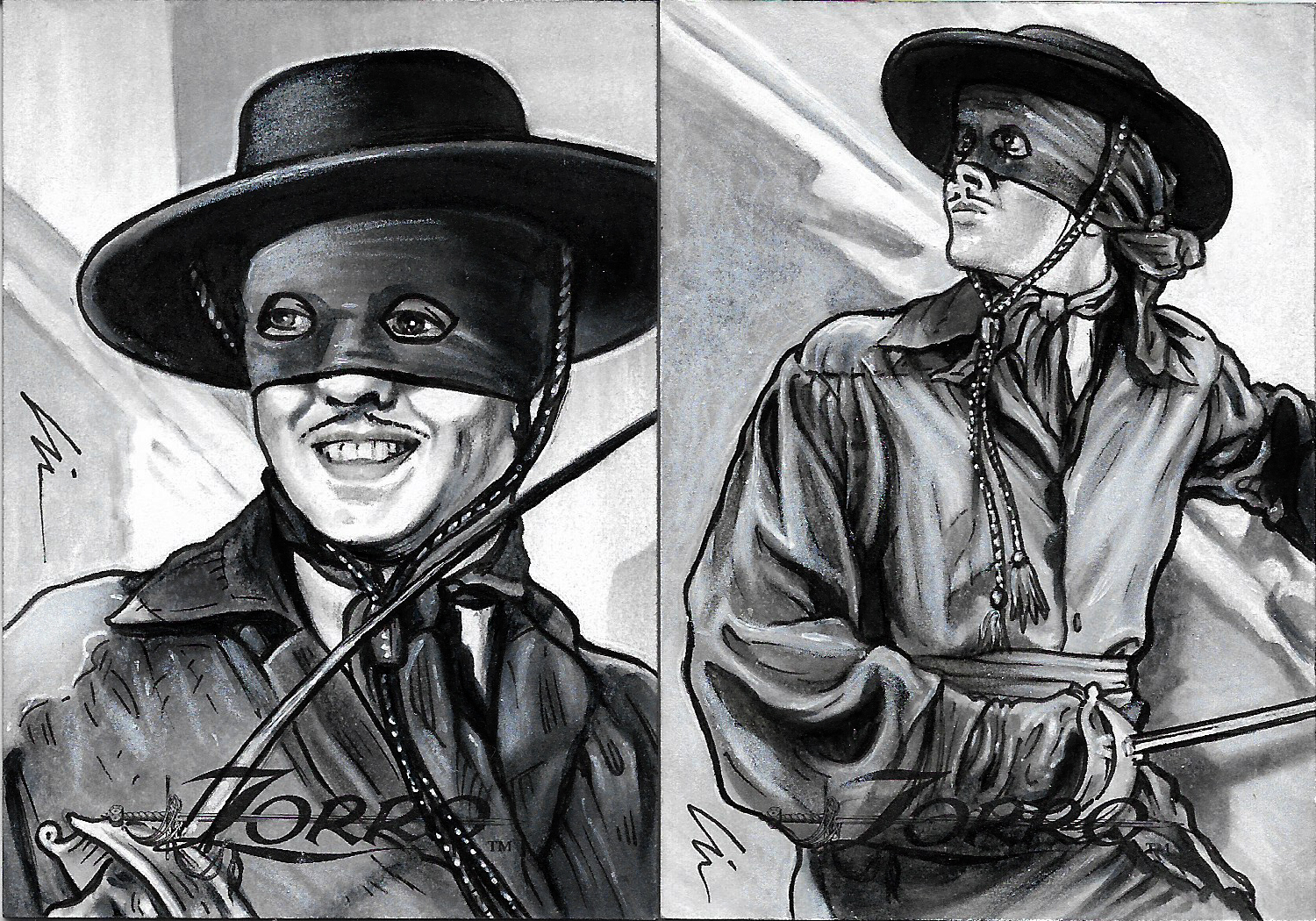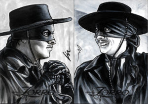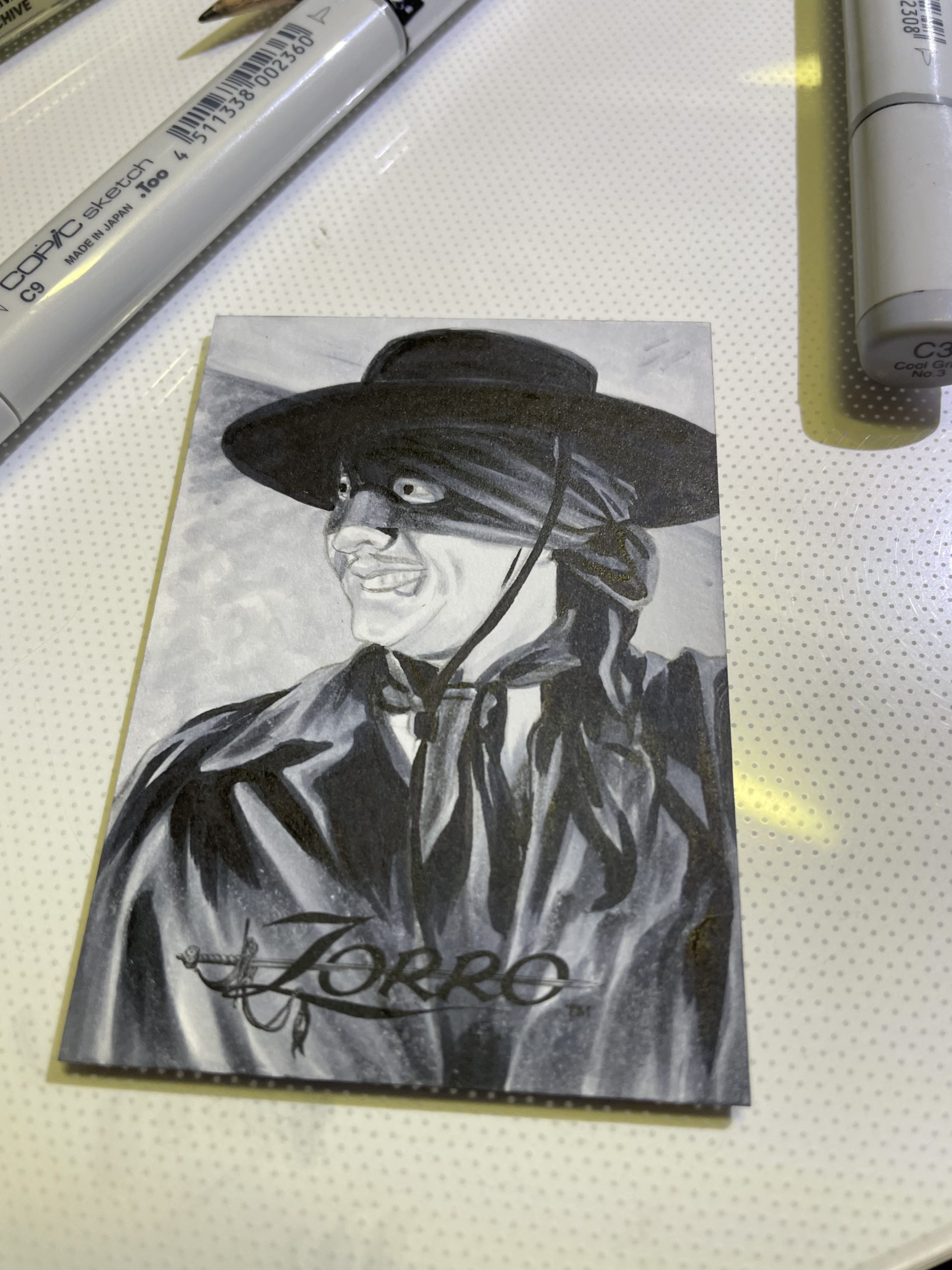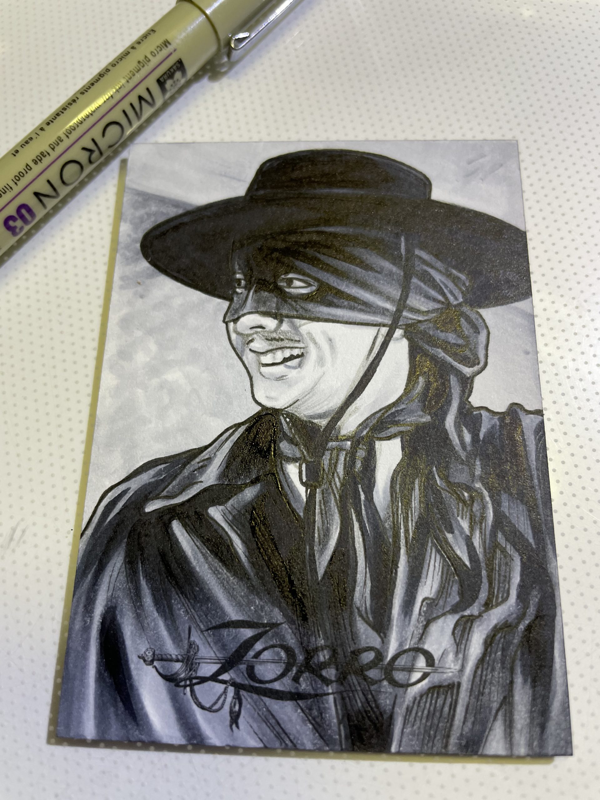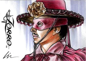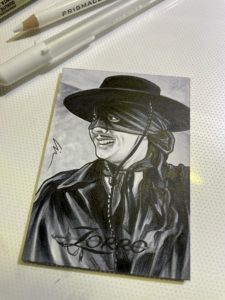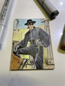 I’ve posted about the sketchcards I’ve done for RRParks Cards, such as the ones done for their Ultraman, Manos, MST3K, and Halloween Trick Or Treat trading card sets. I haven’t posted the Zorro (series 2) sketchcards I did for them, but here they are- and how I created them.