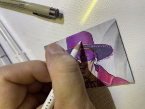 When completed I would do a quick signature on the front, spray the cards with a clear fixative (I use Krylon Workable Fixative), and then sign (printed) the back of the cards and add my website address.