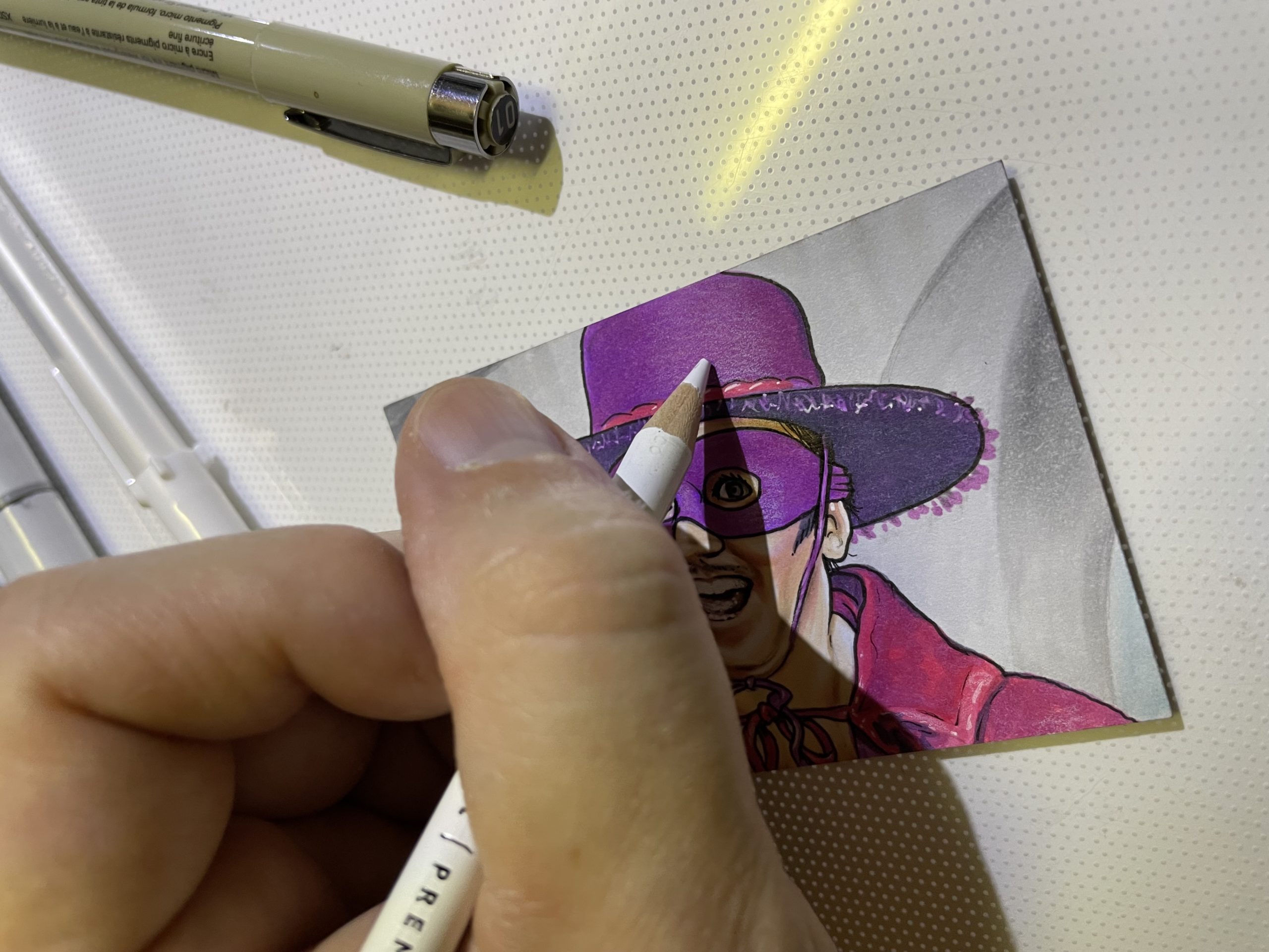Once I was done with the markers I used a black 03 Pigma Micron pen to ink the card, and then a white Gelly Roll pen and a white Prismacolor pencil for the highlights.