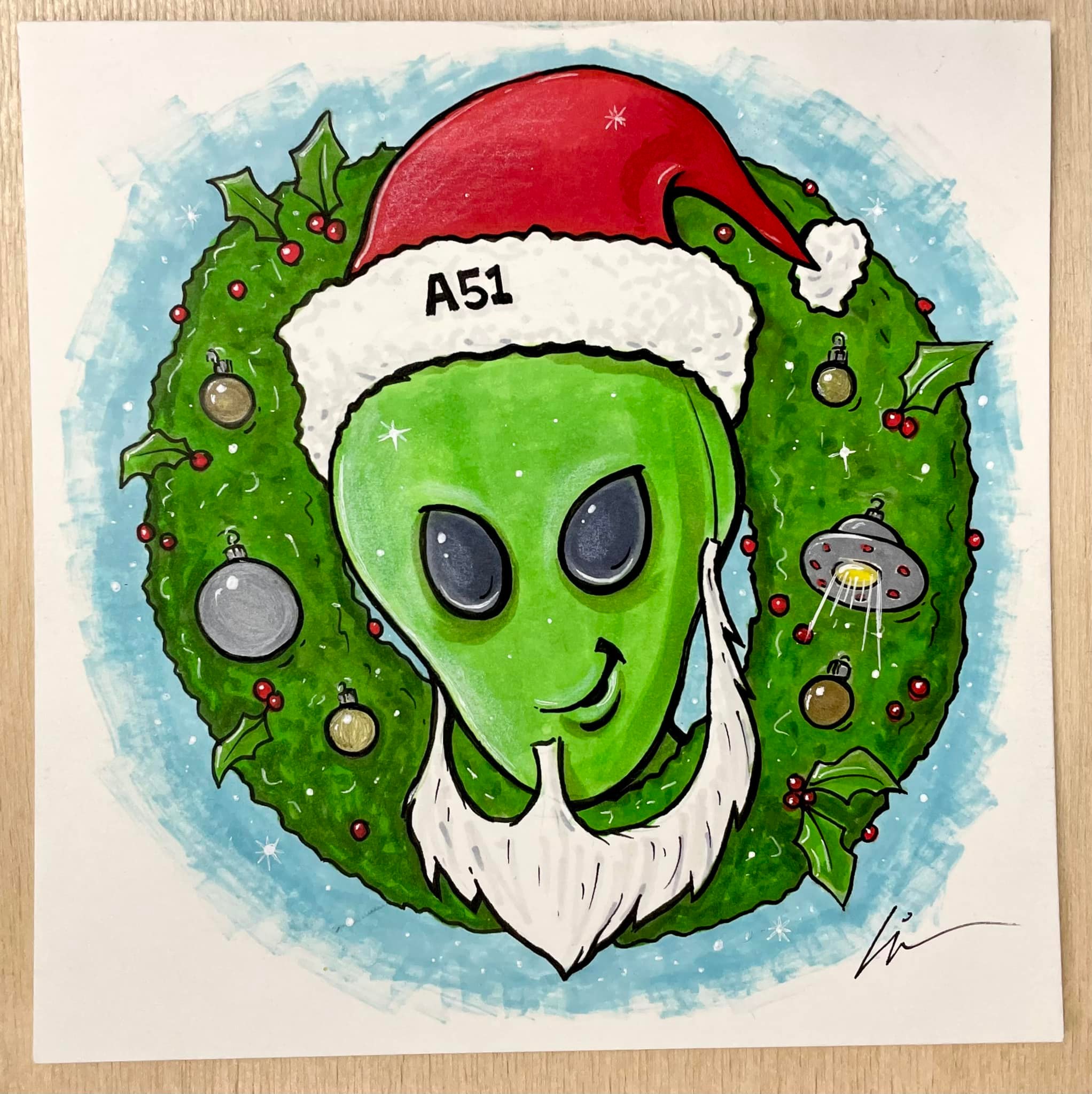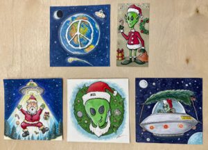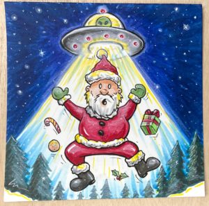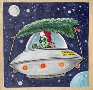I haven’t done a lot of sketching the last few weeks, but did crank out some small marker toons for the hanging Christmas tree display/decoration we have on the wall at Area 51 Ice Cream (where I work part time).