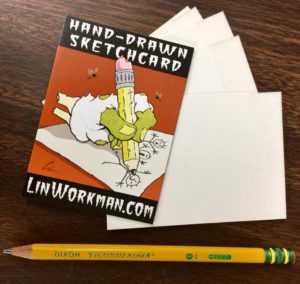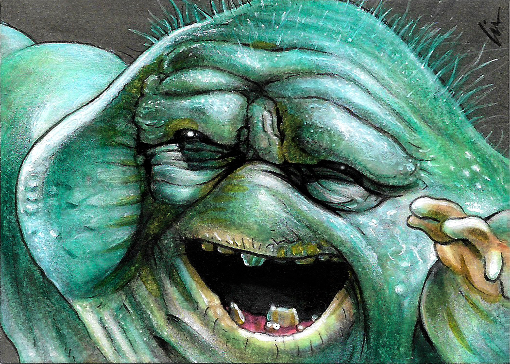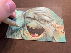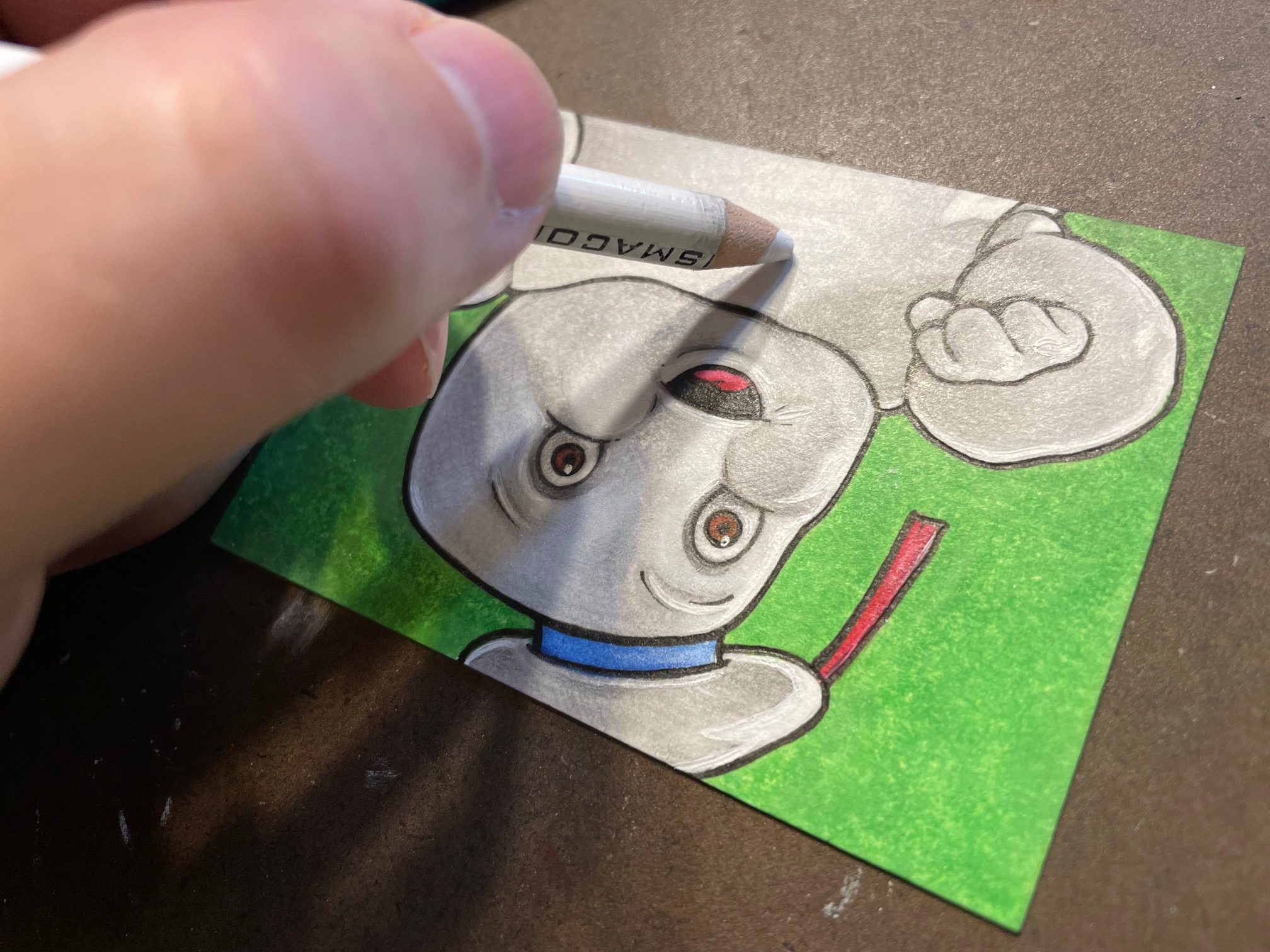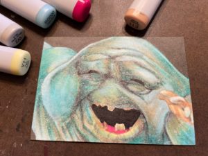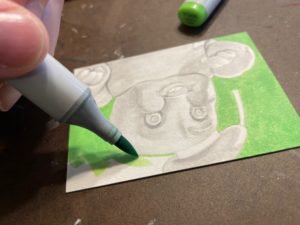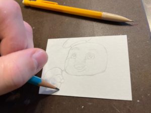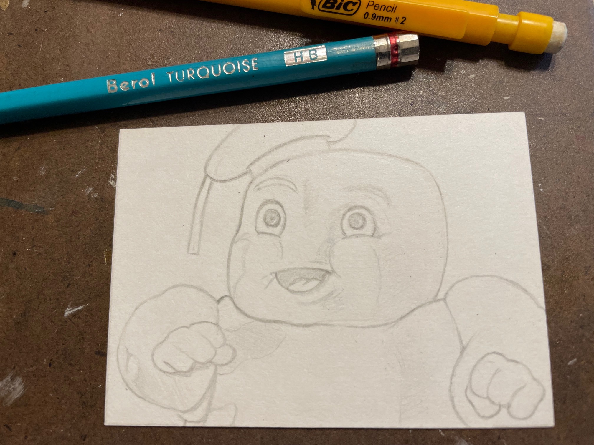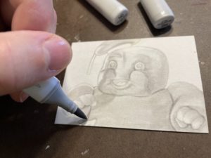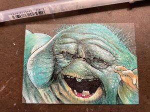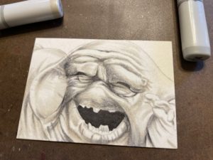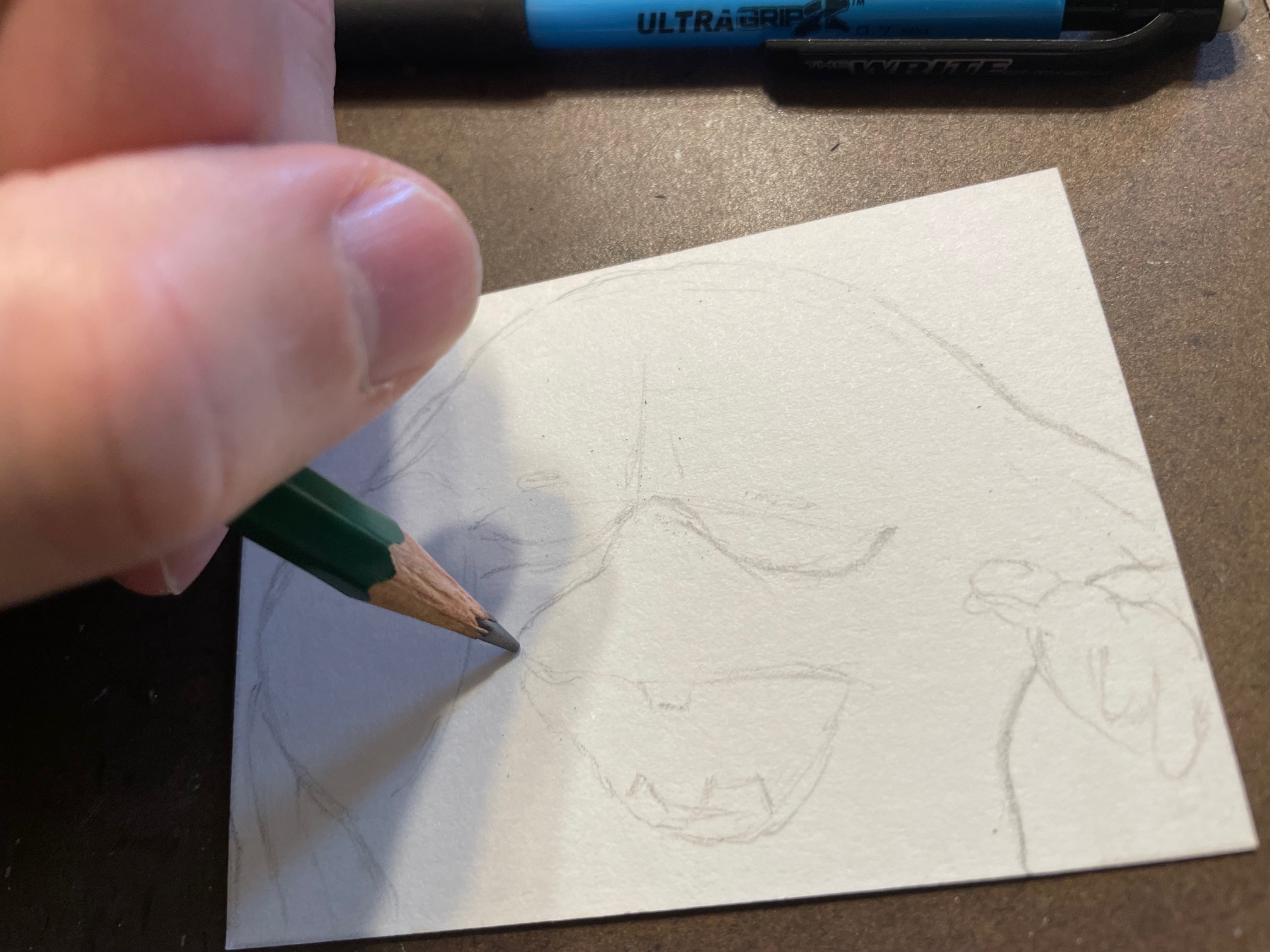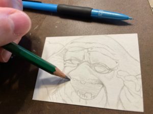 Similarly, for the Muncher sketchcard I started off with an HB pencil. I’ve been sketching more with the wooden pencils- sometimes with an H lead to rough in the sketch. Occasionally I’ll use a click-pencil- usually an .05mm lead.