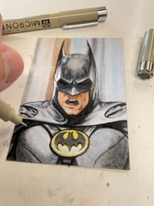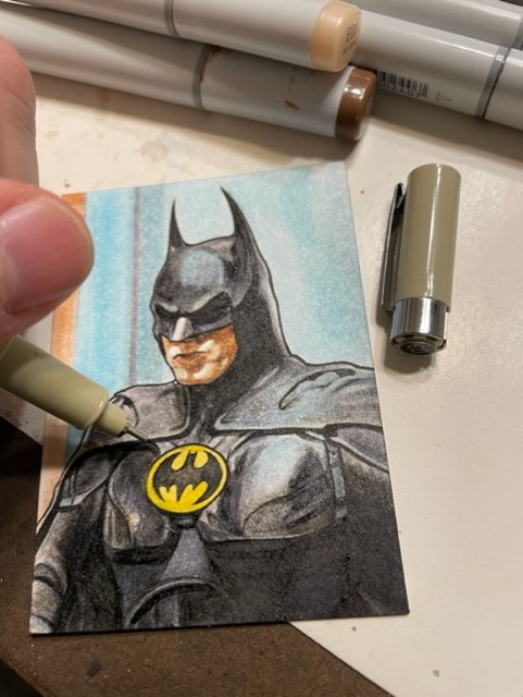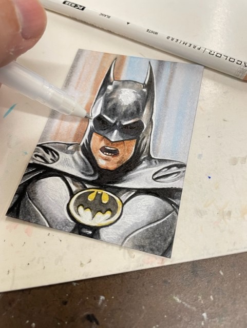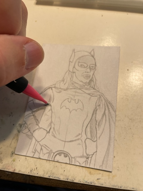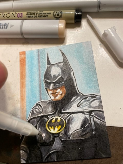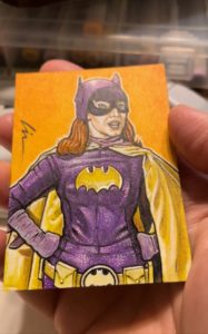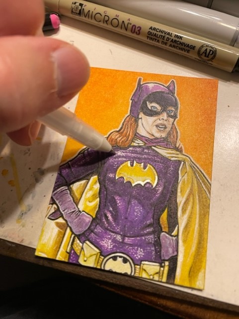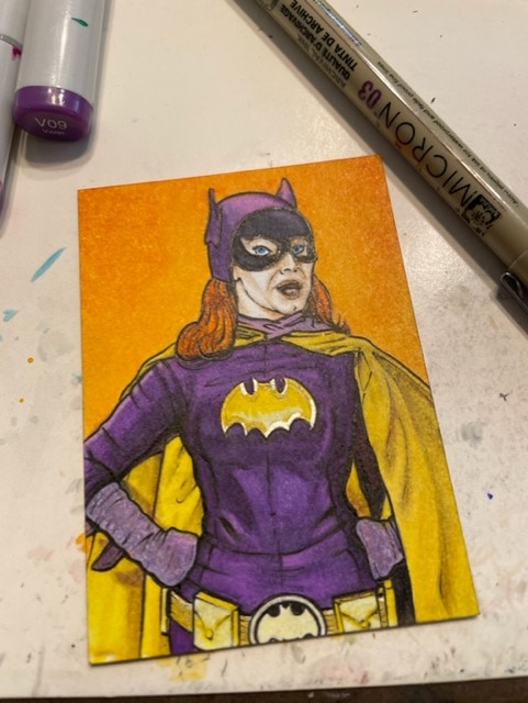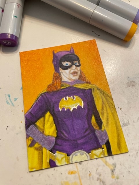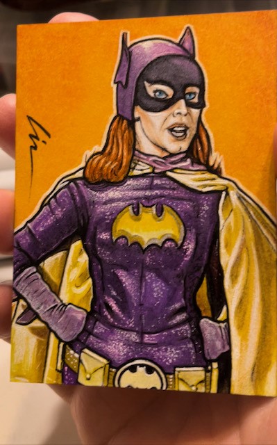 I did the same for the bat emblem and utility belt on a Yvonne Craig as Batgirl sketchcard. I know Marty Rosson with Gabe’s Cave loves the ’60s TV series like I do. These sketchcards have been done as upcoming social media/YouTube giveaways for Gabe’s Cave.