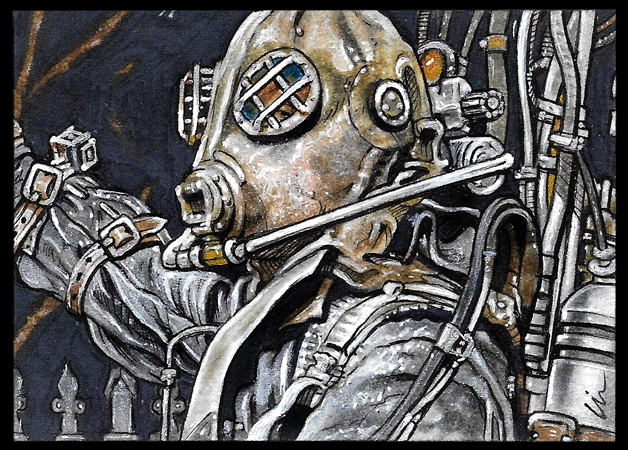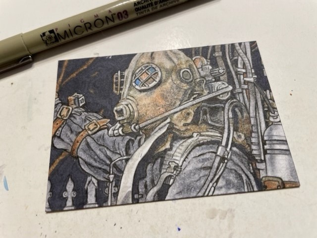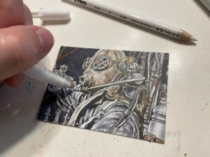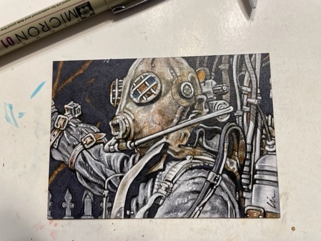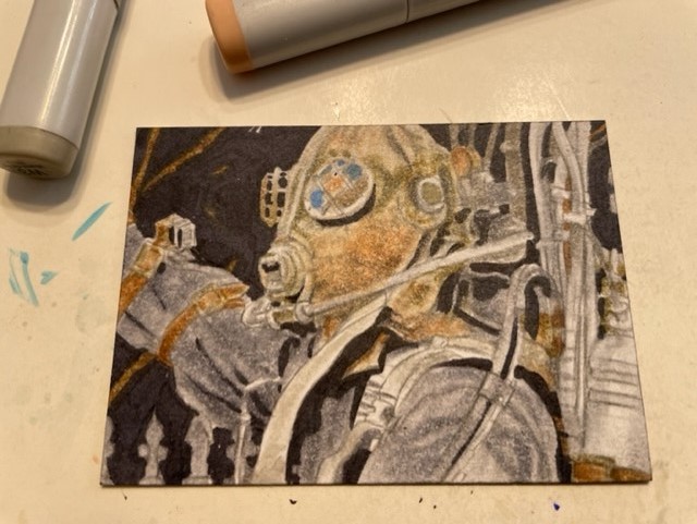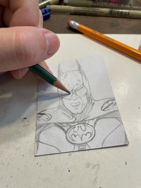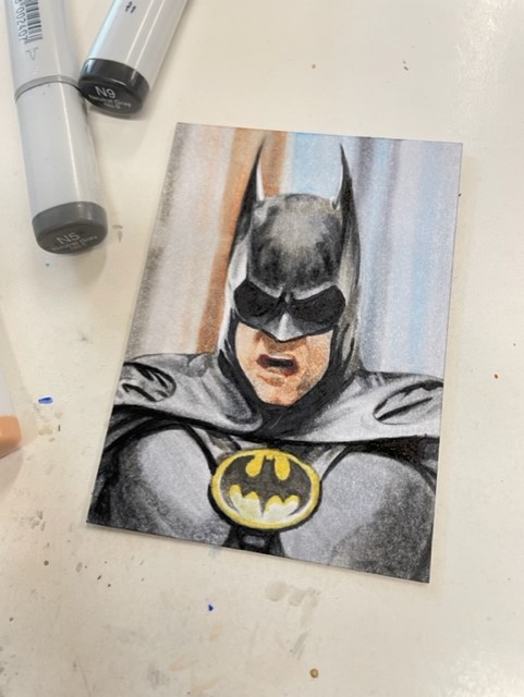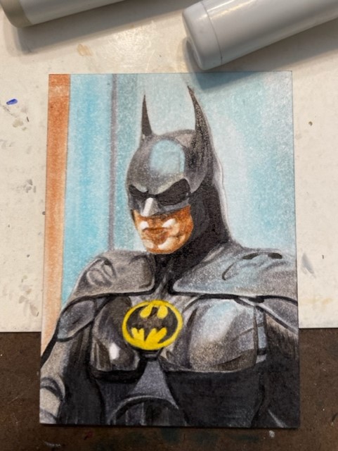 I also did a Brendan Fraser sketchcard as the “Batgirl” movie’s Firefly. Same process for this one- pencils, markers, inks, and highlights.