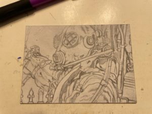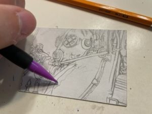 Anyway, for this sketchcard I started off by sketching on their Gabe’s Cave blanks in pencil.