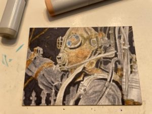 I then broke out my Copic markers– grays, blues, yellows, and flesh-tones.