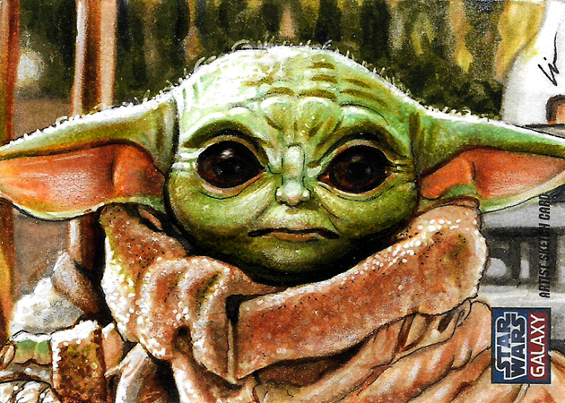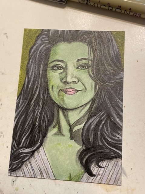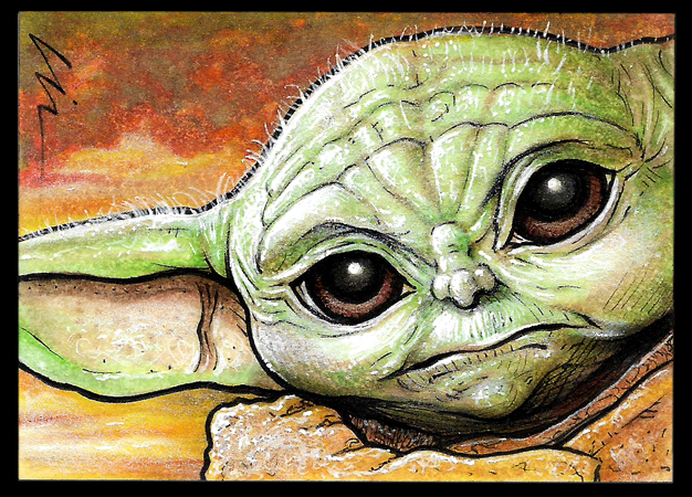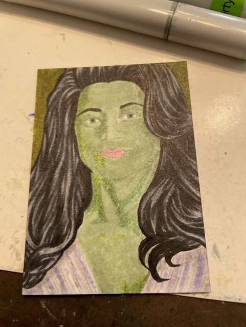 Like my Grogu sketchcard (artist return), there was a lot of green Copic markers used. I try to use at least a couple if not more shades of a color in my drawings, even if they are monochromatic. I think it helps with depth, and keeps the art from looking too flat. That’s something I’ve noticed about some folks starting out with coloring, especially markers. They tend to just lay down a solid base/flat color and don’t shade, blend, or even just let some of the white show through for highlights (I’m still working on that last one myself).