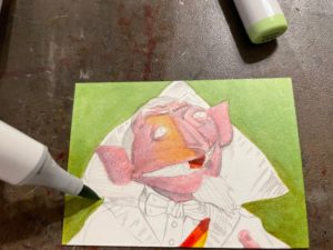 After I got the pencils done I broke out my Copic markers and started coloring his lavendar’ish fleece fleshtone, and then filled in the background.
