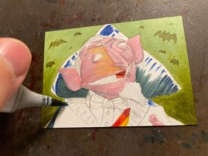 Once the art was completed I sprayed a couple light coats of Krylon workable fixative to protect it. Sometimes I will do a light coat over the highlights before using the Prismacolor pencil. Helps protect the highlights and gives the card surface a bit of tooth for the Prismacolor to hold on to.