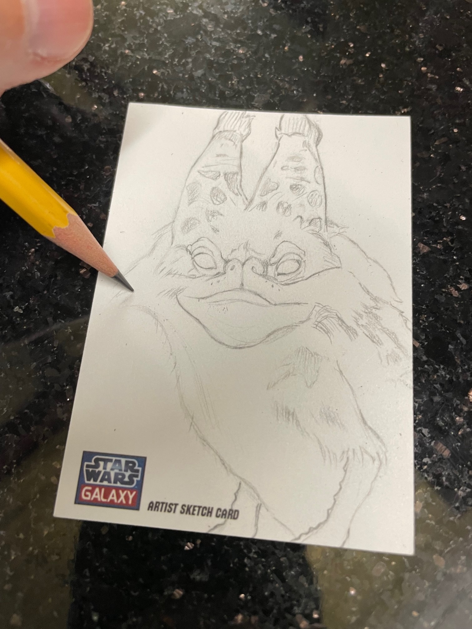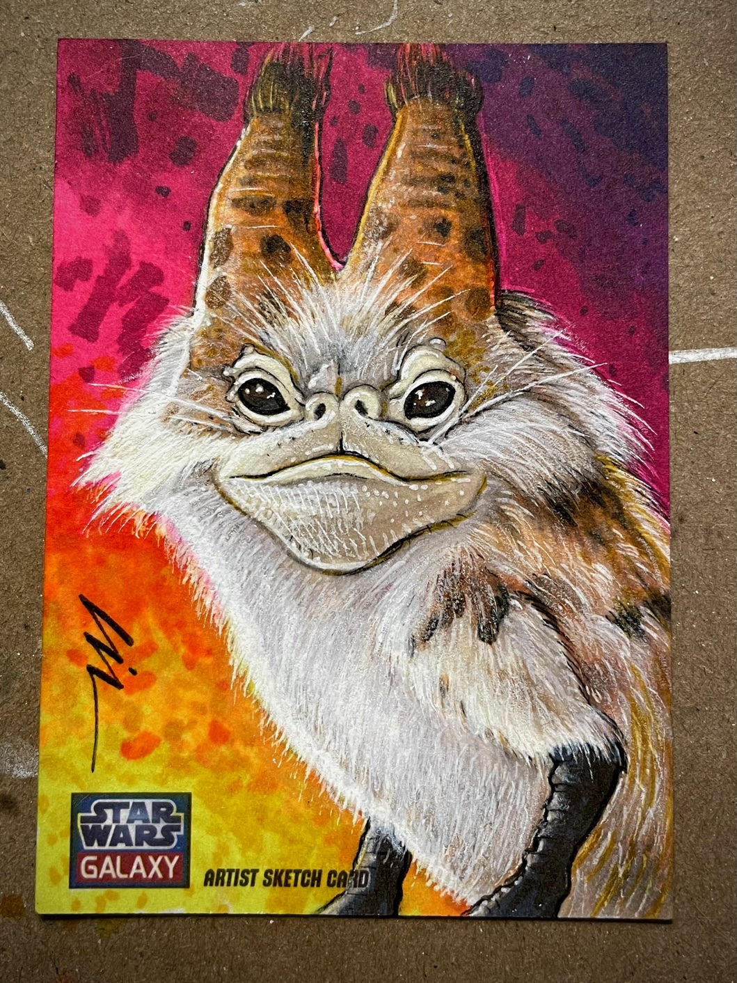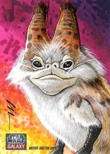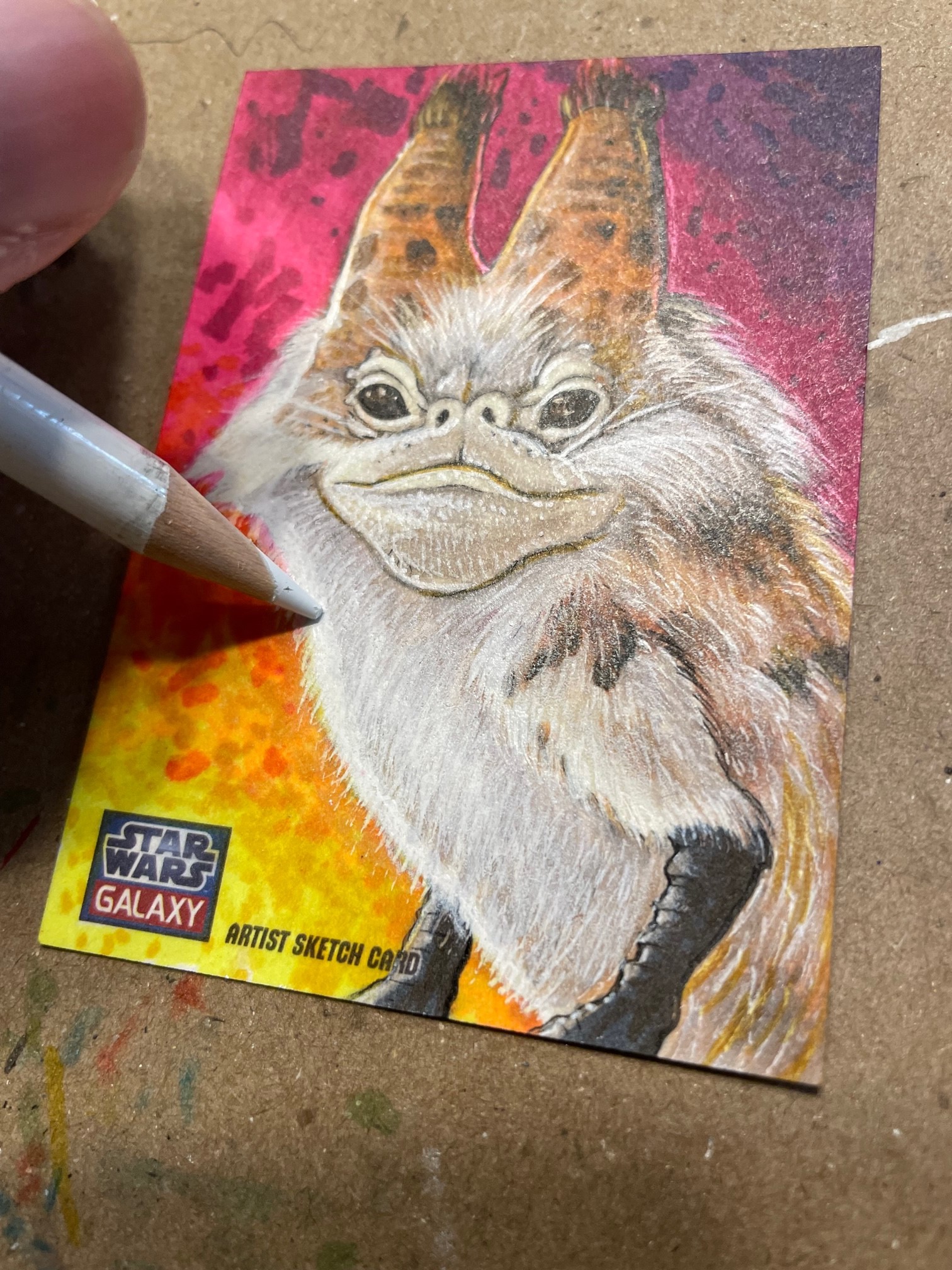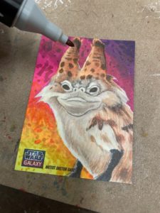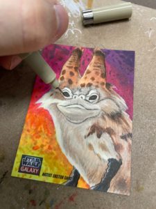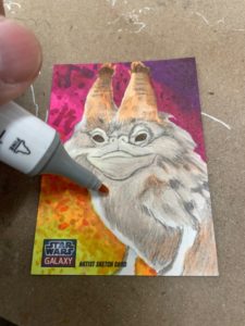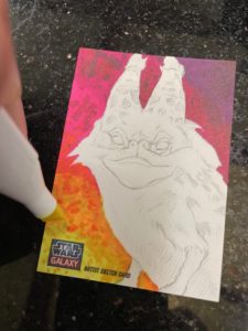 For this cat card I started off with pencils using a yellow #2 on a Star Wars Galaxy sketchcard blank. I still have a few returns left over from my time working with Topps. I then broke out markers. Started filling in the background first. Sabine is all about bright colors so I wanted this card to reflect that.