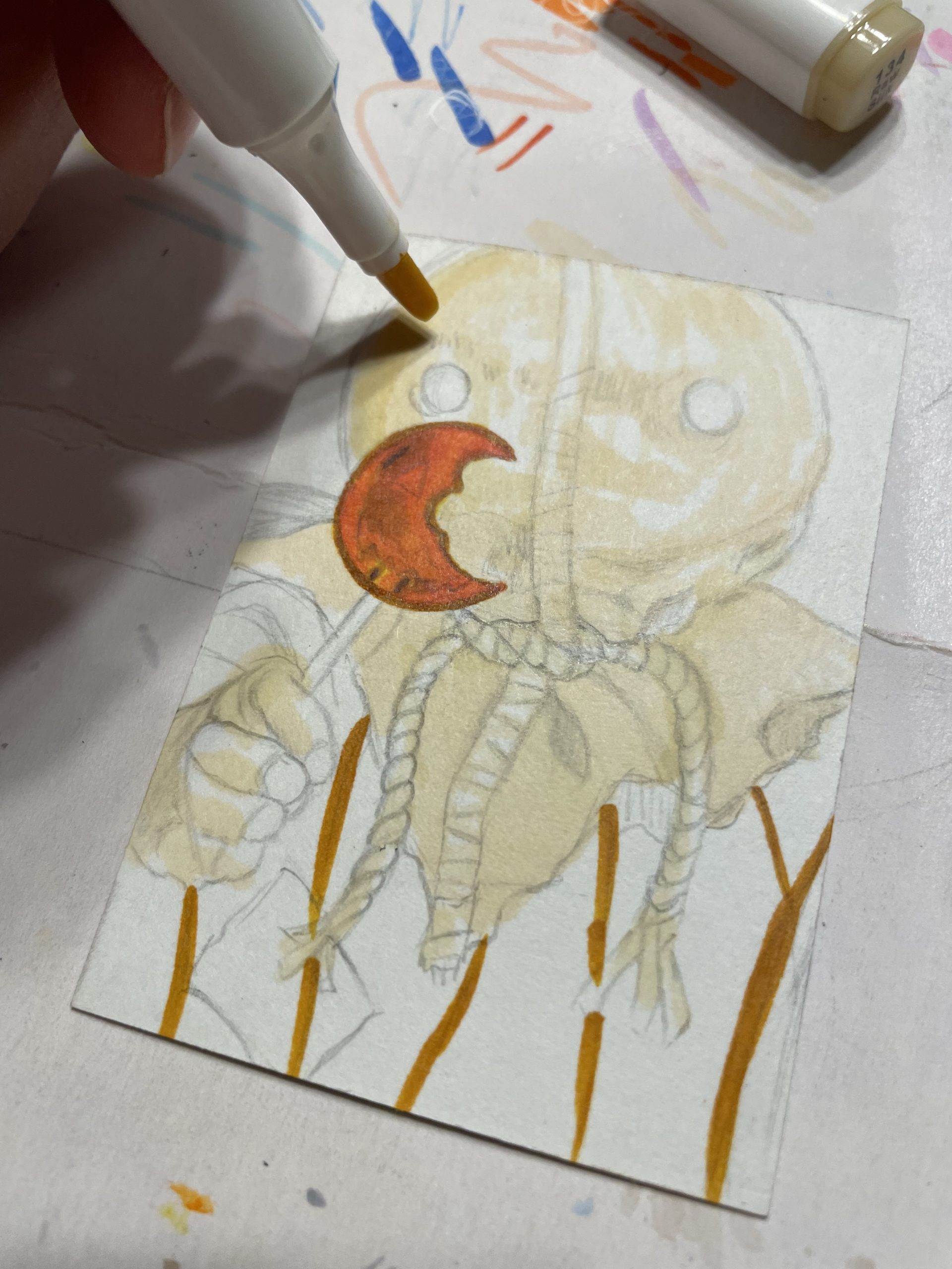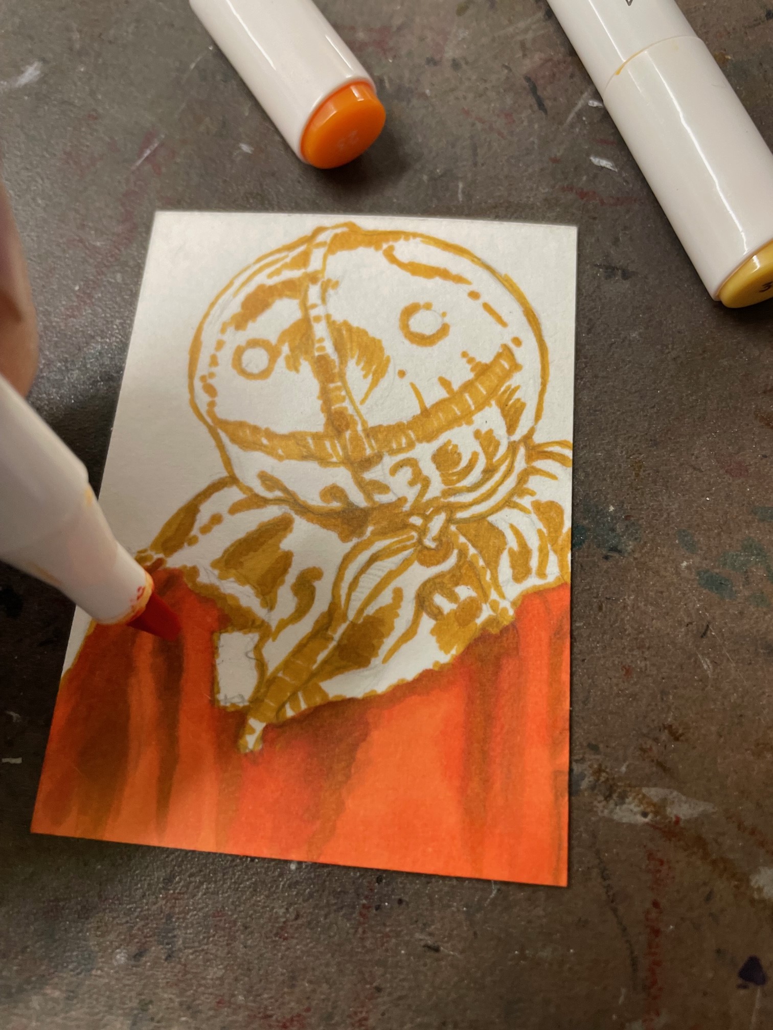 For this card I started off with a ckick pencil (HB lead), and then broke out some markers. I started off with some orange and tan shades.